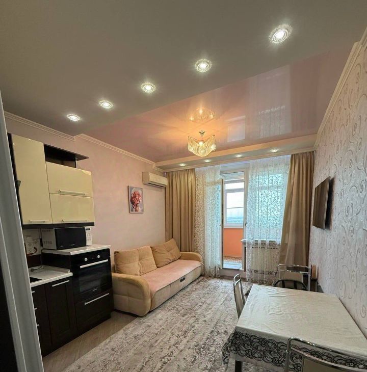 • Кухня-гостиная с выходом на утепленную лоджию с теплым полом (еще одна дополнительная комната), обеденная зона, мягкий диван