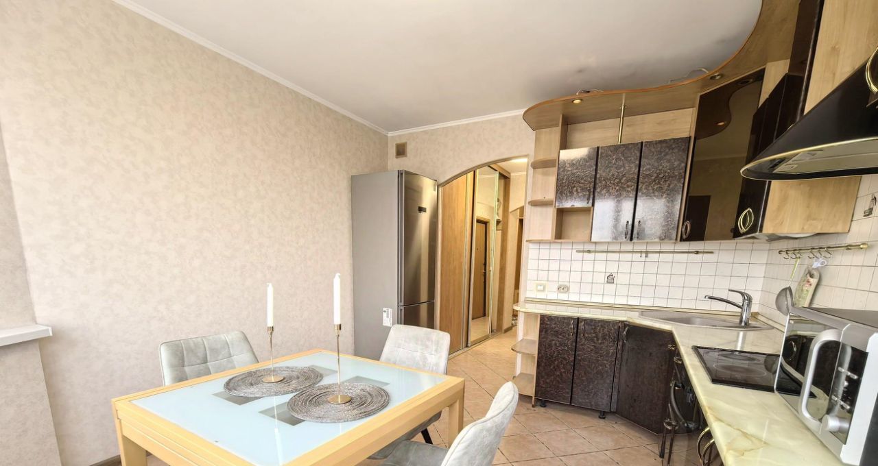 Добротная встроенная кухня, оборудованная техникой: варочная поверхность, вытяжка с подсветкой, электрический духовой шкаф, микроволновка, чайник, 2-хкамерный холодильник. Раскладной стол, 4 стула.