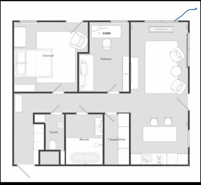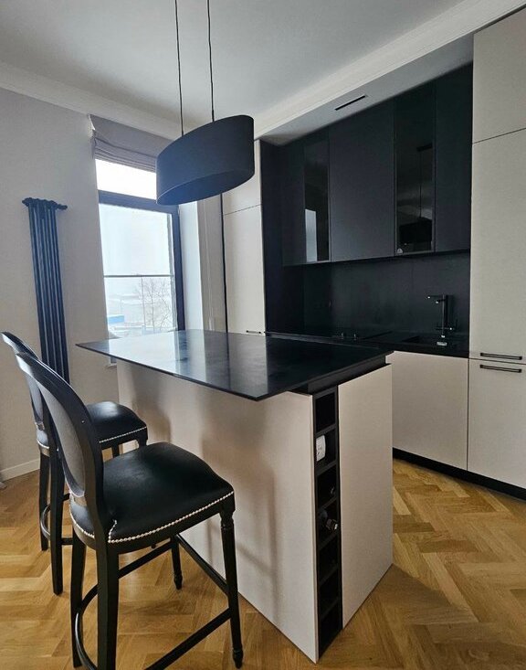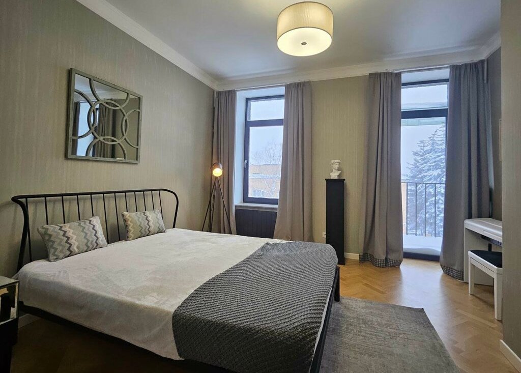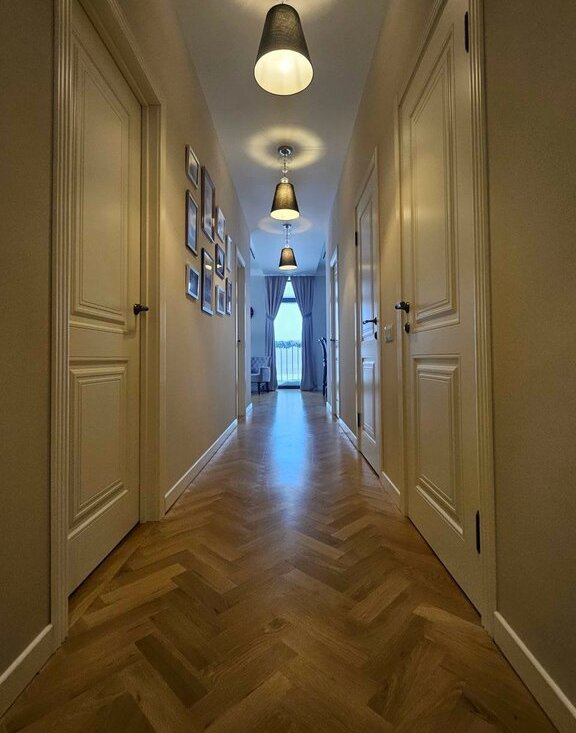 Апартаменты включают гостиную, кухню, спальню, кабинет, гардеробную, два сан.узла, прихожую, два балкона. Для отделки использованы качественные материалы, дубовый паркет, наруральный камень на подоконниках и кухне.