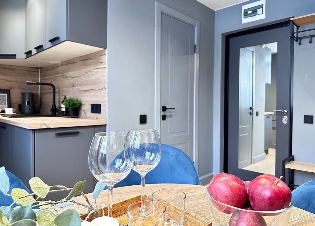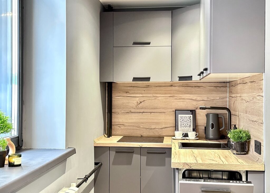 Полностью оборудованная кухня с кухонной зоной и встроенной техникой (варочная панель, посудомоечная машина, холодильник, микроволновка, чайник, кофемашина, посуда).