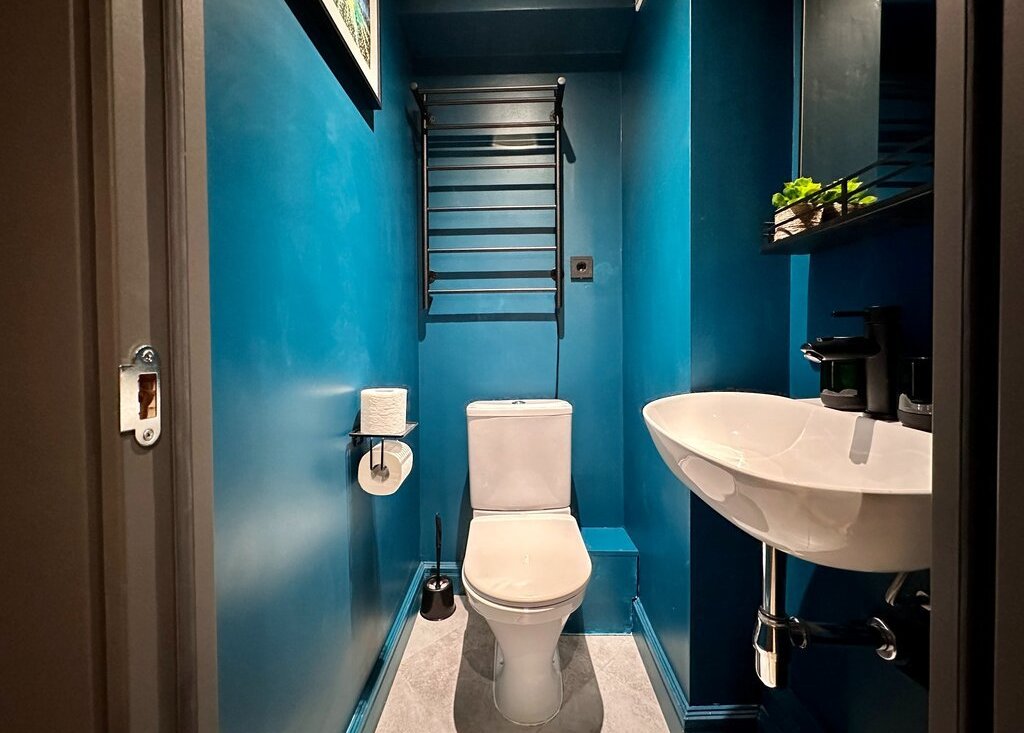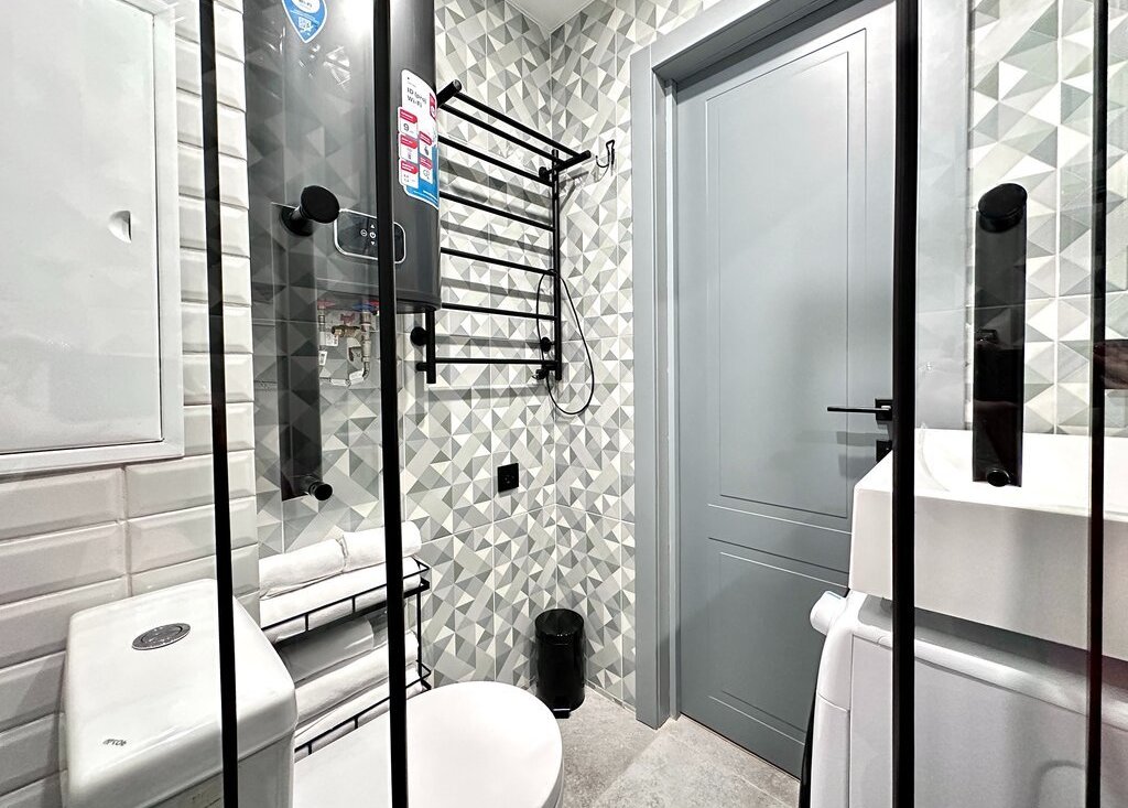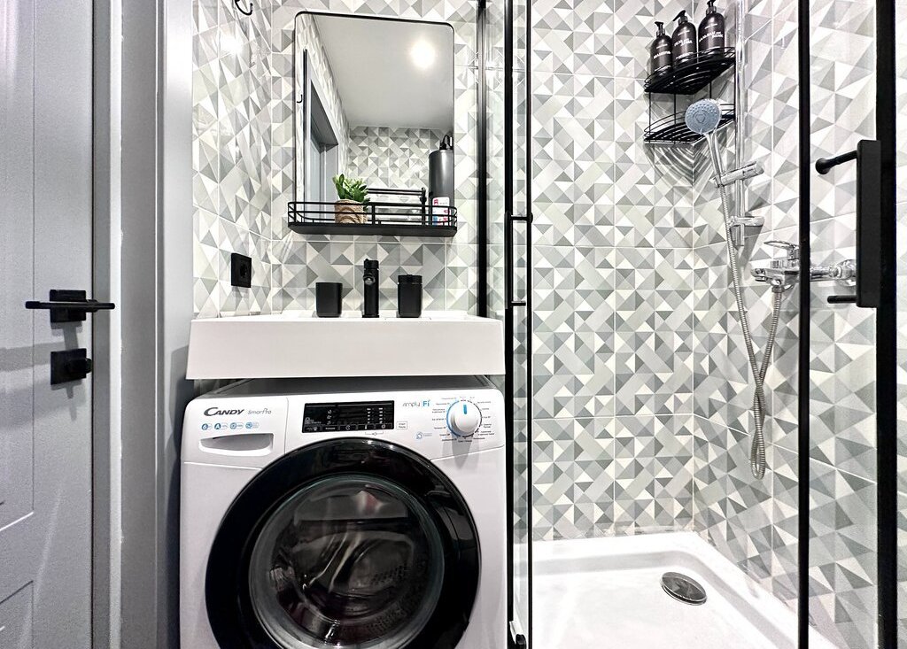 Основной санузел с душевой кабиной, стиральной машиной и всеми удобствами.