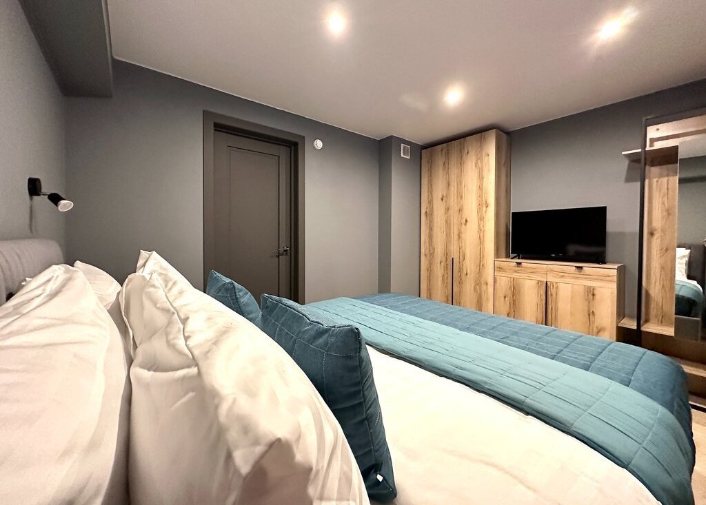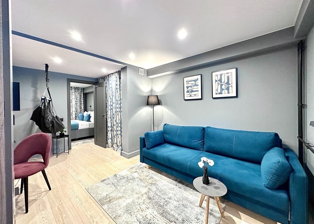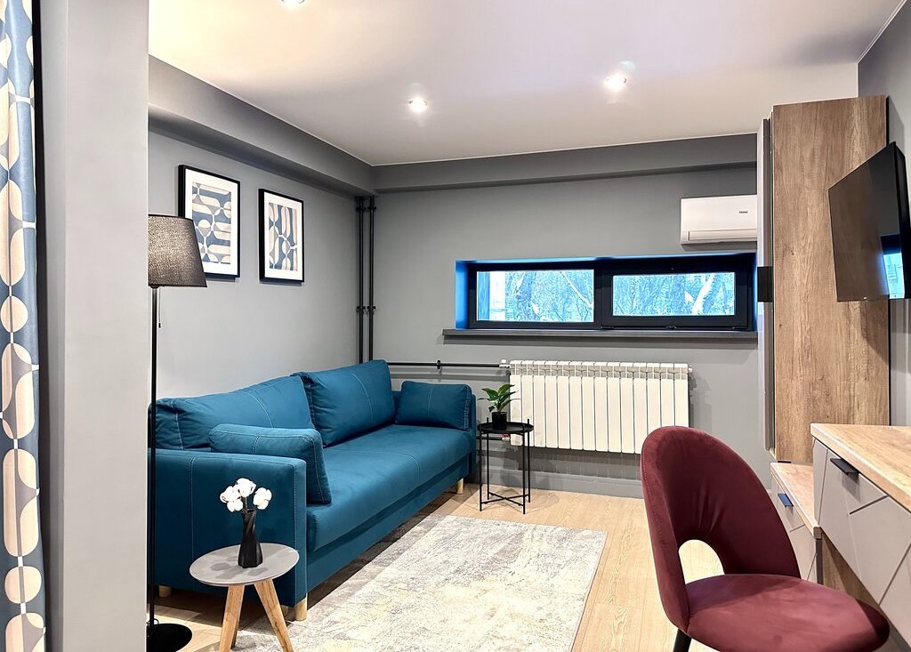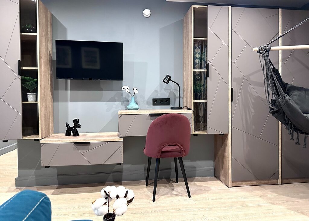 Смежная просторная гостиная с раскладным диваном и SmartTV.