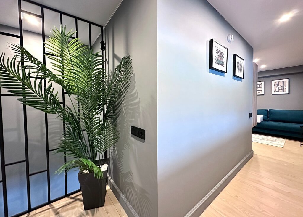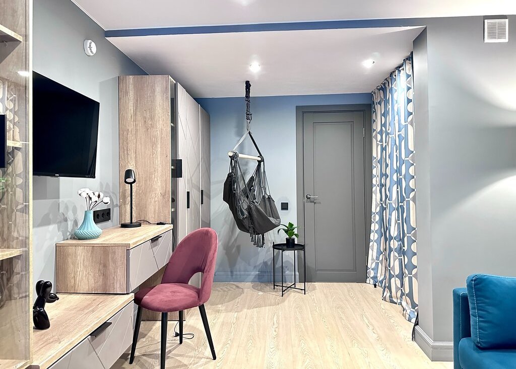Интерьер светлый, минималистичный, с элементами скандинавского дизайна. Много дерева, текстиля и уютных деталей.