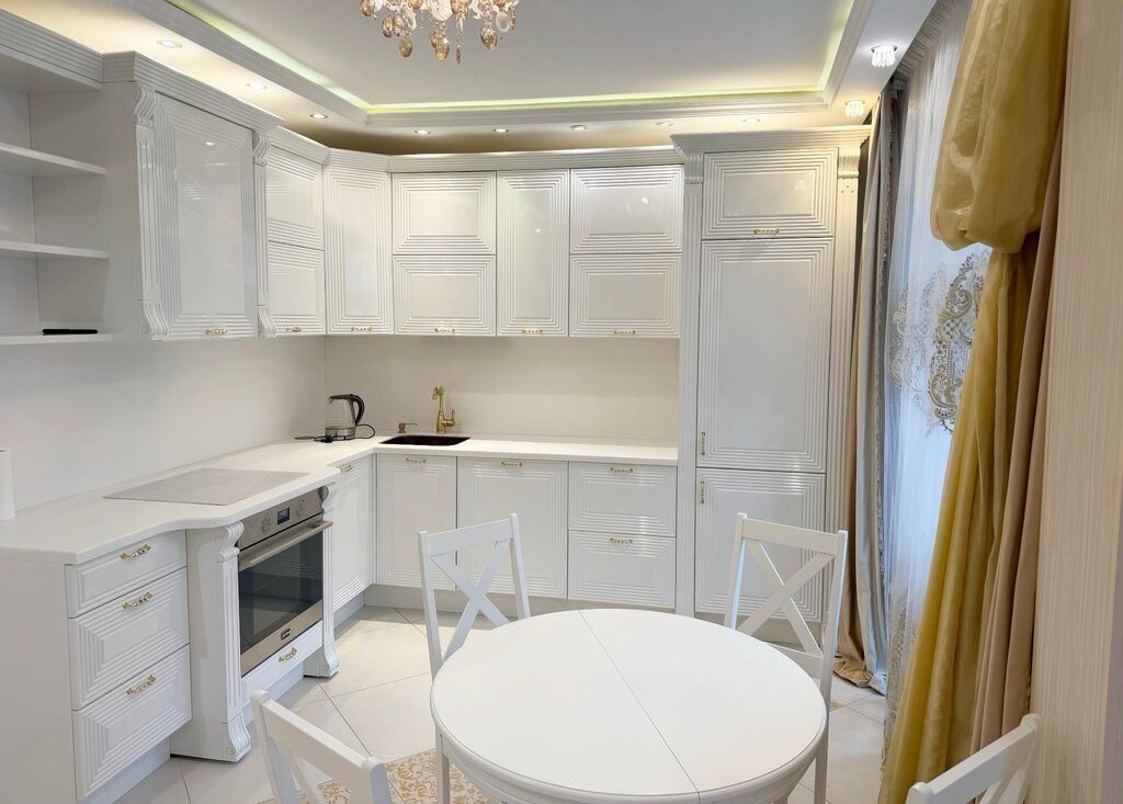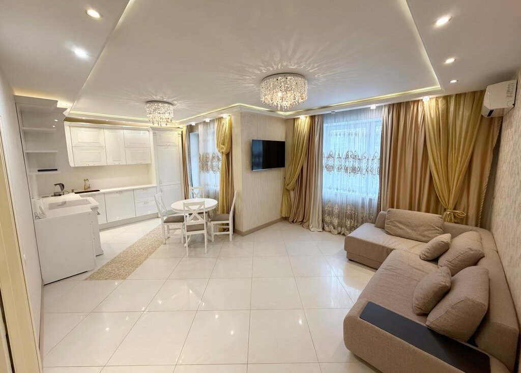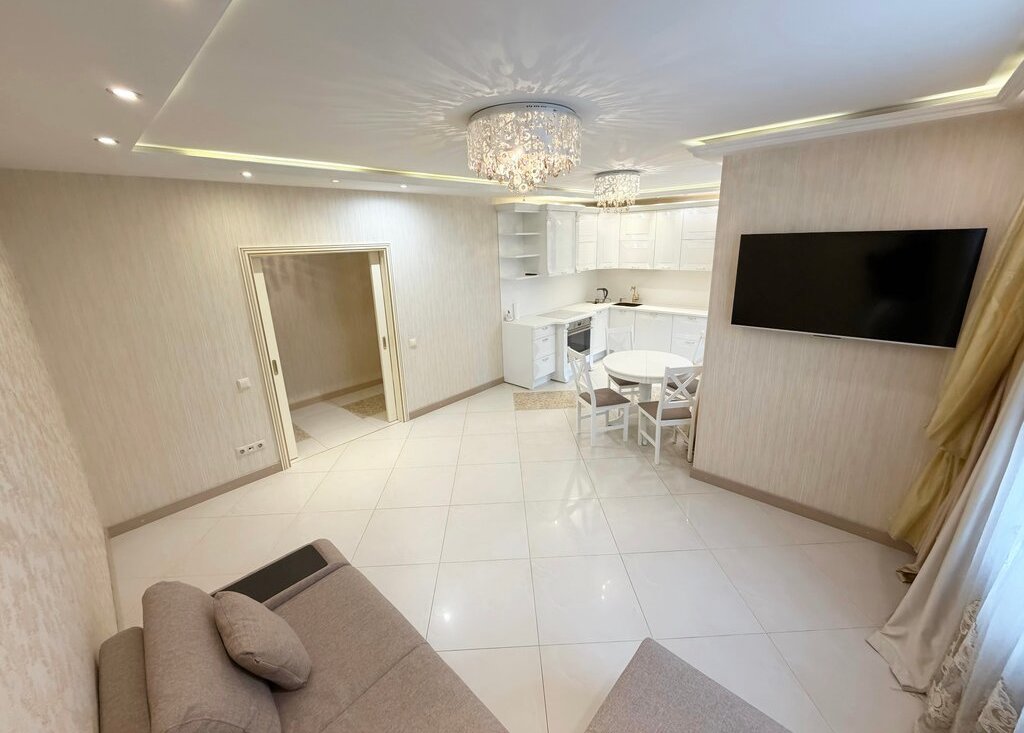 в центральной части квартиры расположена просторная гостиная комната, совмещенная с кухней, что позволить проводить уютные, совместные вечера Вам и вашей семье.