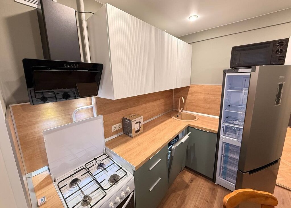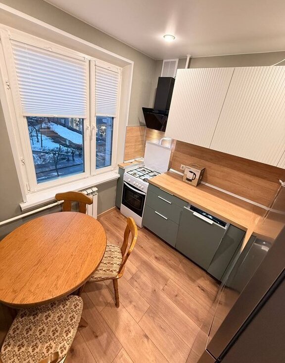 Кухня: установлен НОВЫЙ кухонный гарнитур, газовая плита. Новый холодильник. Новая посудомойка. Обеденный стол.