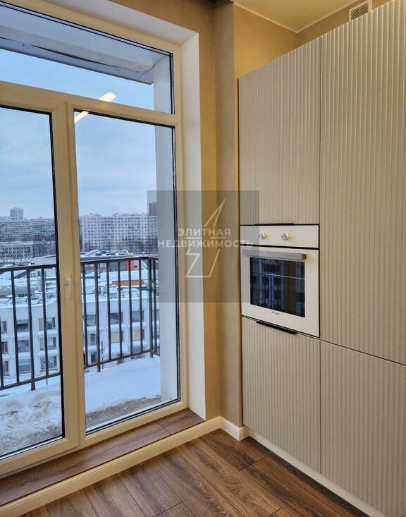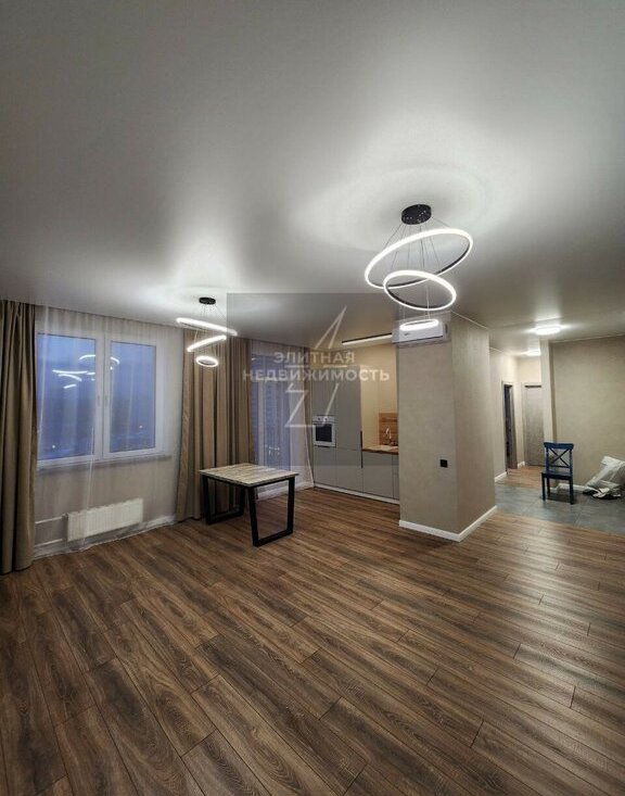 В квартире просторная кухня - гостиная 35 м, две спальни 15 и 9 м и гардеробная, большой санузел. В гостиной балкон с панорамным окном.