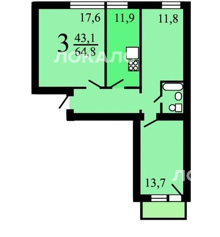 Общая площадь 64,8 кв.м, окна на две стороны, три изолированные комнаты, большая кухня (12 кв.м), большая лоджия.