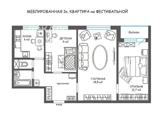 МЕБЛИРОВАННАЯ 3 к. КВАРТИРА на ФЕСТИВАЛЬНОЙ