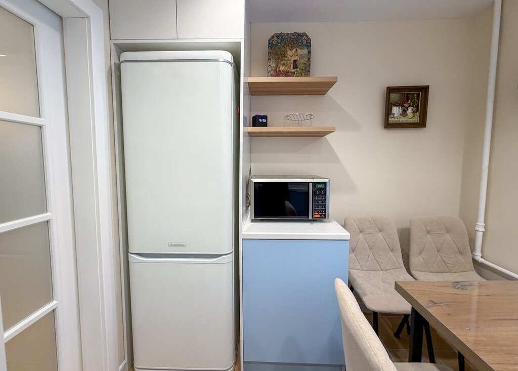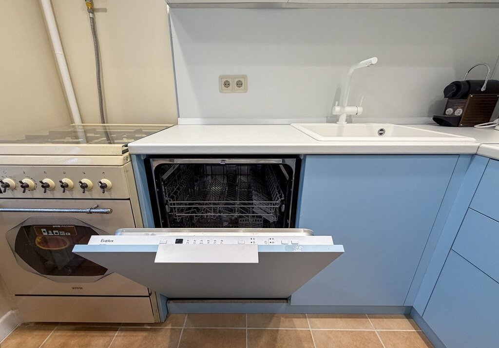 - кухня с полной комплектацией техники: холодильник, широкая посудомоечная машина, газовая плита с духовкой, вытяжка, СВЧ‑печь, кофеварка, чайник;