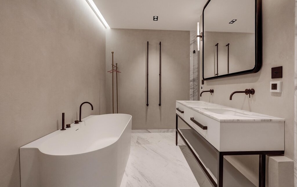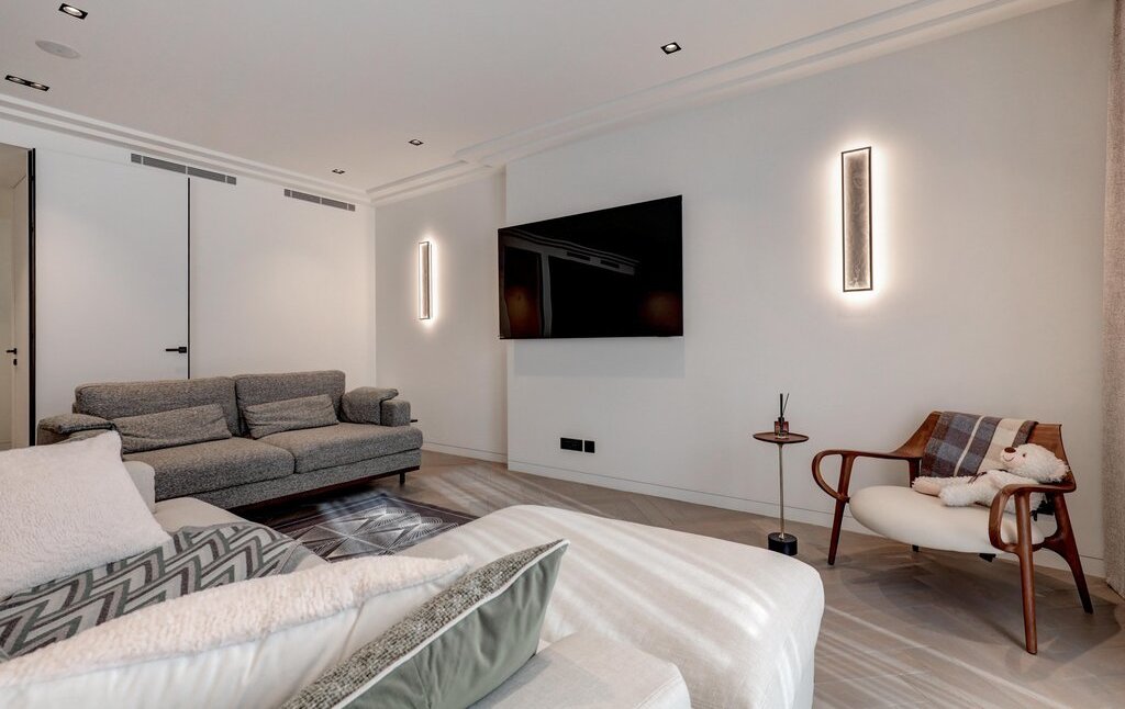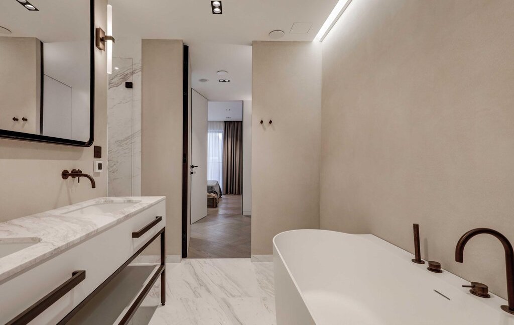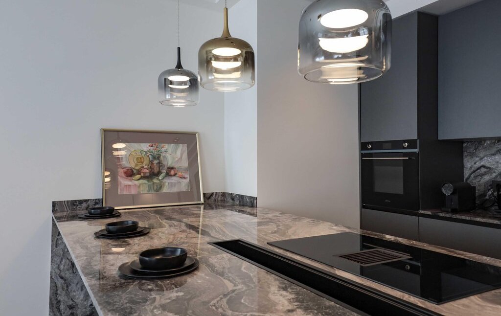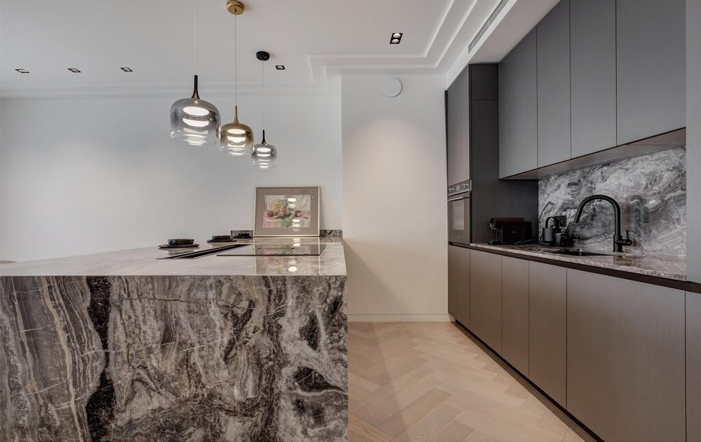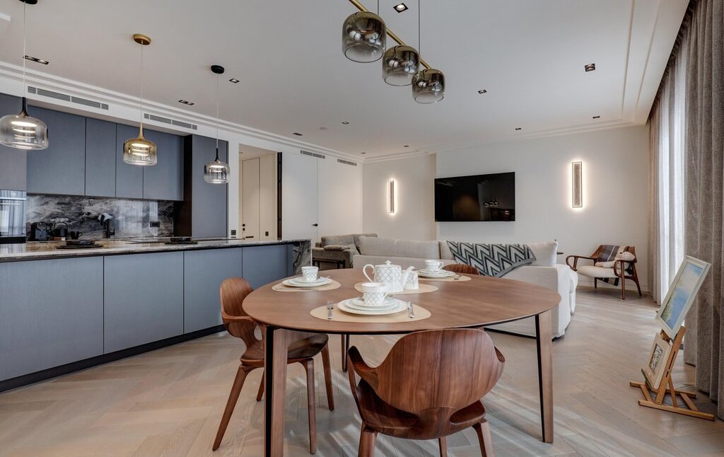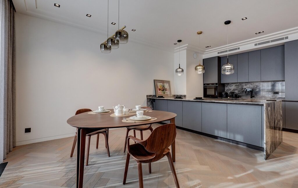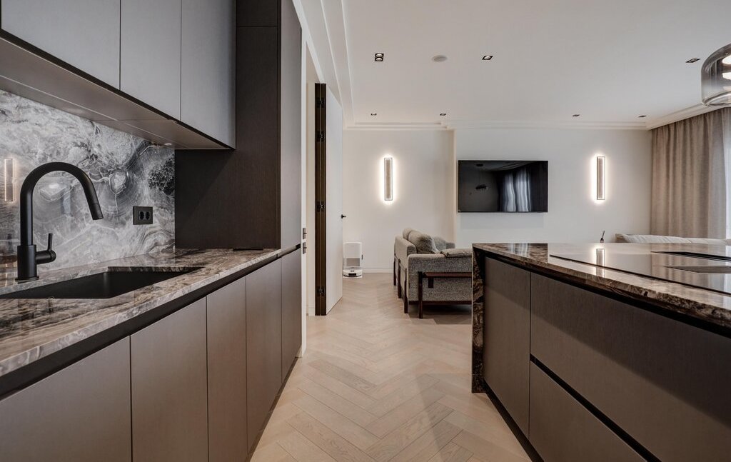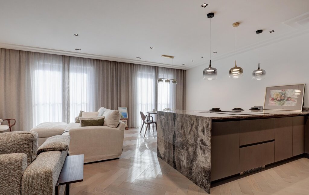 Просторная кухня-гостиная, в которой проливается теплый свет через панорамные окна, станет точкой притяжения для всей семьи и гостей. Остров, выполненный из натурального мрамора, послужит идеальным местом для готовки, обеденная зона никогда не будет пустовать, а уютные мягкие диваны, привезенные из Италии, позволят вам в полной мере насладиться отдыхом.