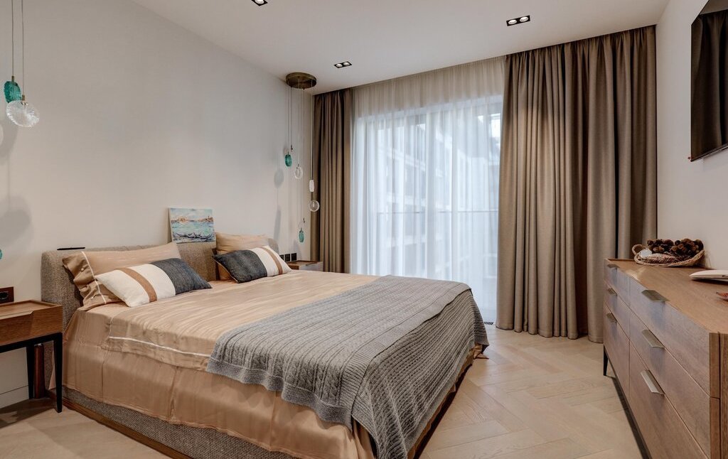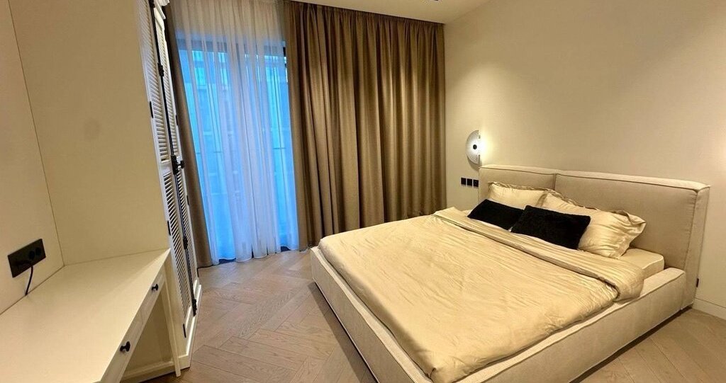 В отделке квартиры были использованы только качественные материалы. Итальянская мебель и текстиль, обеденный стол из натурального дерева и кофемашина от Bork, остров и столешница из натурального камня, ковер дизайнерской работы, бытовая техника от Smeg, окна в пол от Schuko - все сделано с любовью и заботой об арендаторах.
