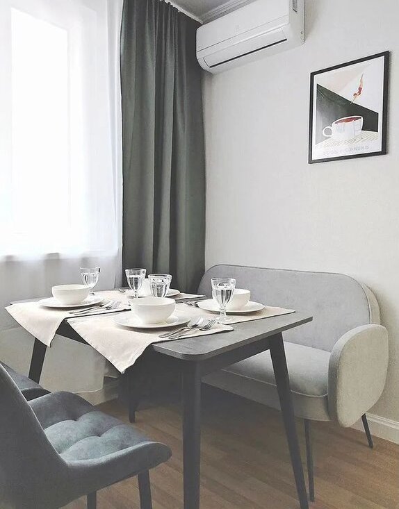В квартире уютная мягкая мебель, шкафы для хранения, комплект посуды и столовых приборов.
