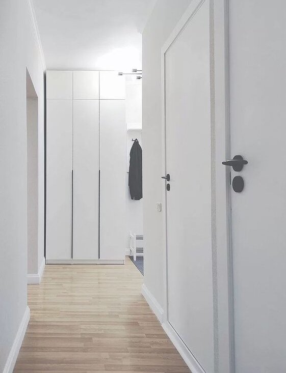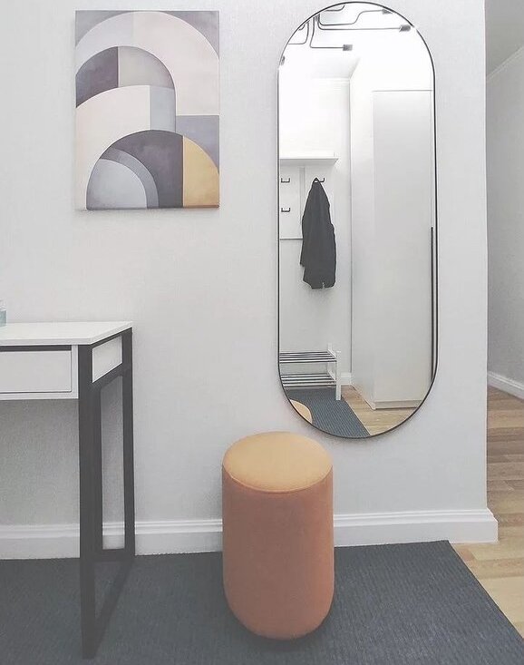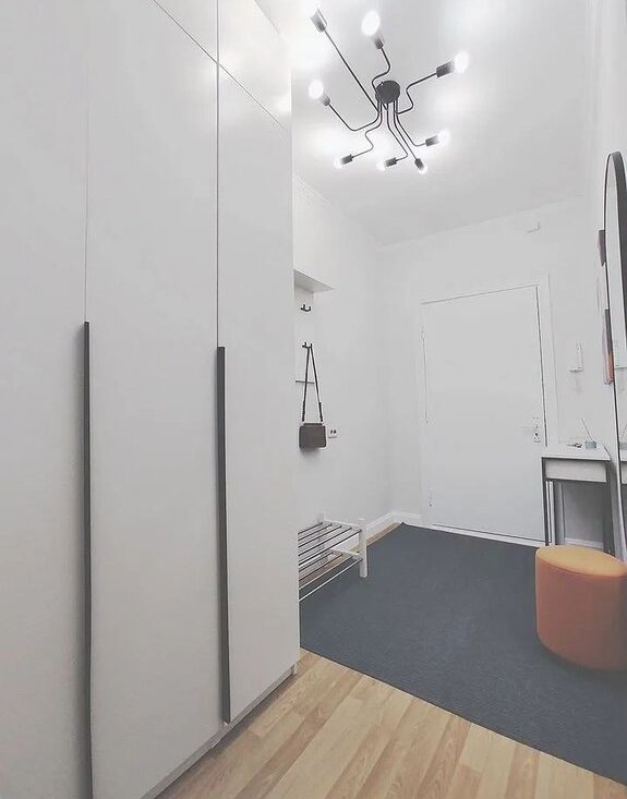 В прихожей зеркало в полный рост, вместительный шкаф, консоль и тумба под обувь.