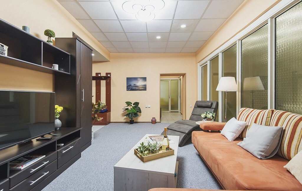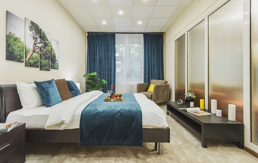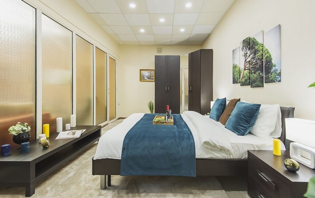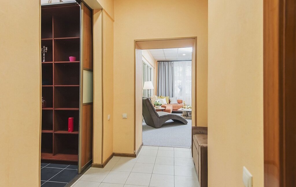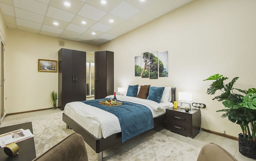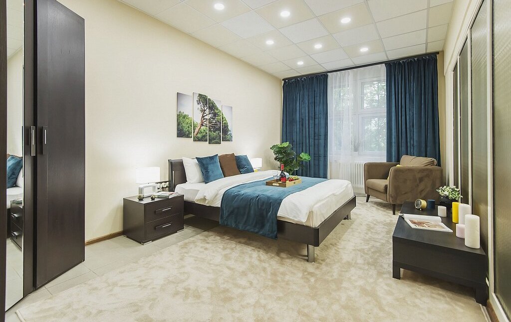 Спальные комнаты оснащены двуспальными кроватями, платяными шкафами, прикроватными тумбами и предметами декора. Просторная гостиная площадью более 30 кв. метров позволит Вам душевно провести время в кругу семьи или небольшой компании друзей. Наличие вместительной гардеробной комнаты сделает Ваше пребывание в квартире более комфортным. В нашей квартире есть все , что может вам потребоваться - бытовая техника, включая стиральную и посудомоечную машины, ЖК-телевизоры, микроволновая печь, холодильник. К Вашим услугам высокоскоростной беспроводной интернет, кабельное телевидение, фен.