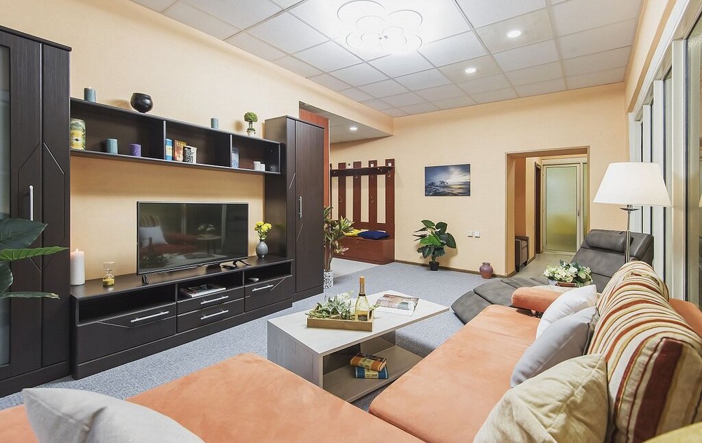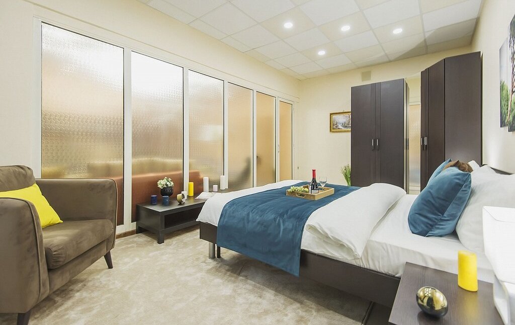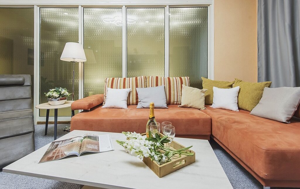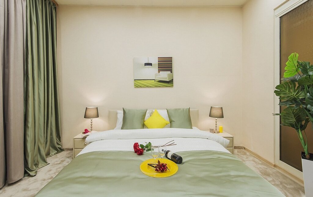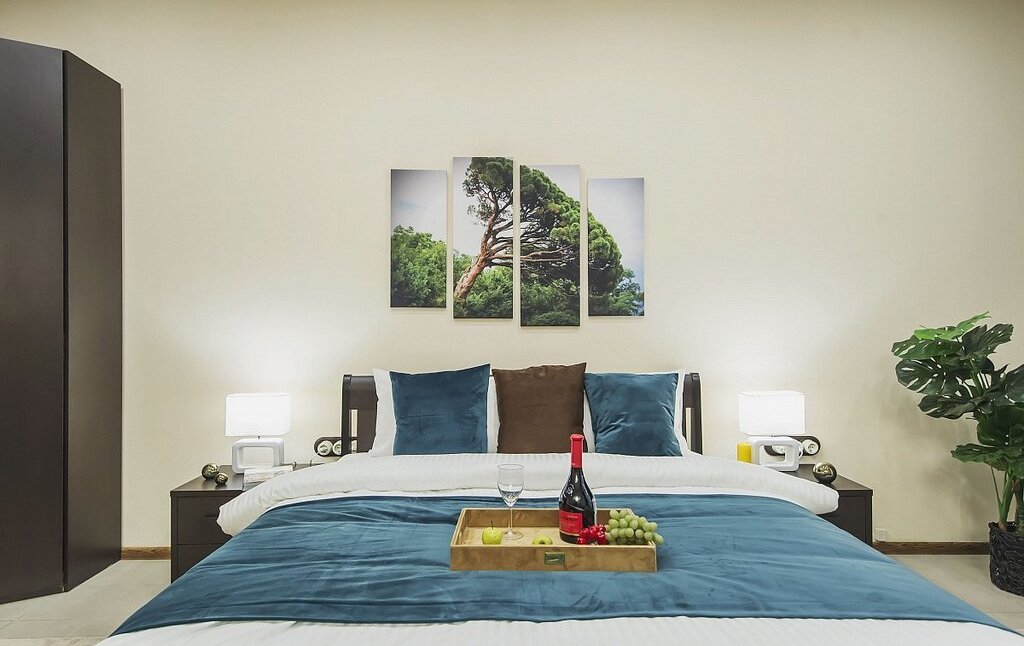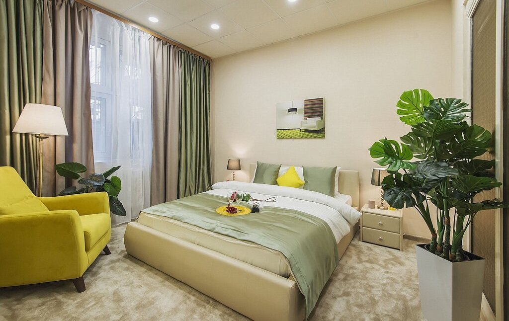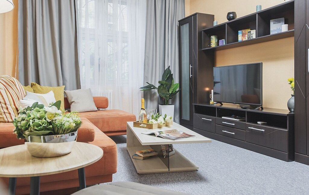 Спальные комнаты оснащены двуспальными кроватями, платяными шкафами, прикроватными тумбами и предметами декора. Просторная гостиная площадью более 30 кв. метров позволит Вам душевно провести время в кругу семьи или небольшой компании друзей. Наличие вместительной гардеробной комнаты сделает Ваше пребывание в квартире более комфортным. В нашей квартире есть все , что может вам потребоваться - бытовая техника, включая стиральную и посудомоечную машины, ЖК-телевизоры, микроволновая печь, холодильник. К Вашим услугам высокоскоростной беспроводной интернет, кабельное телевидение, фен.