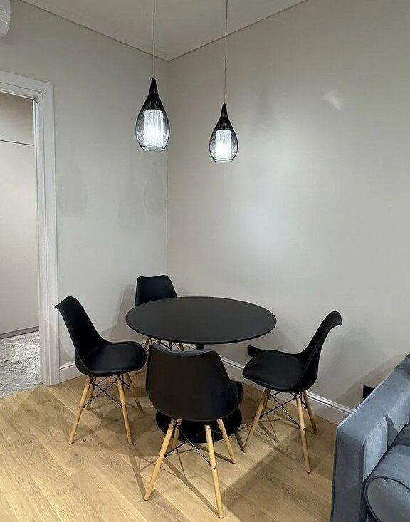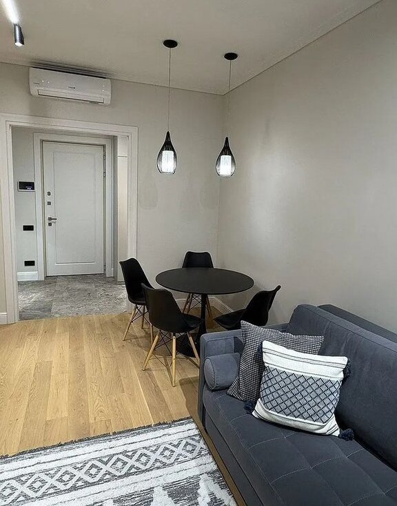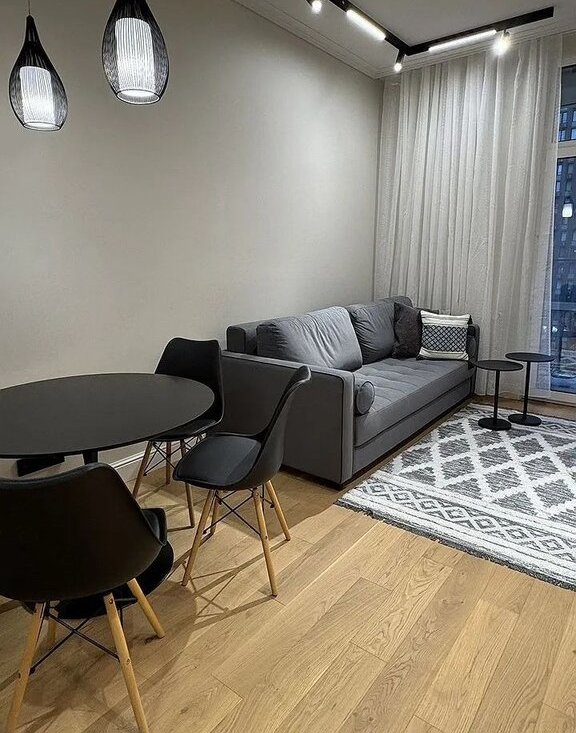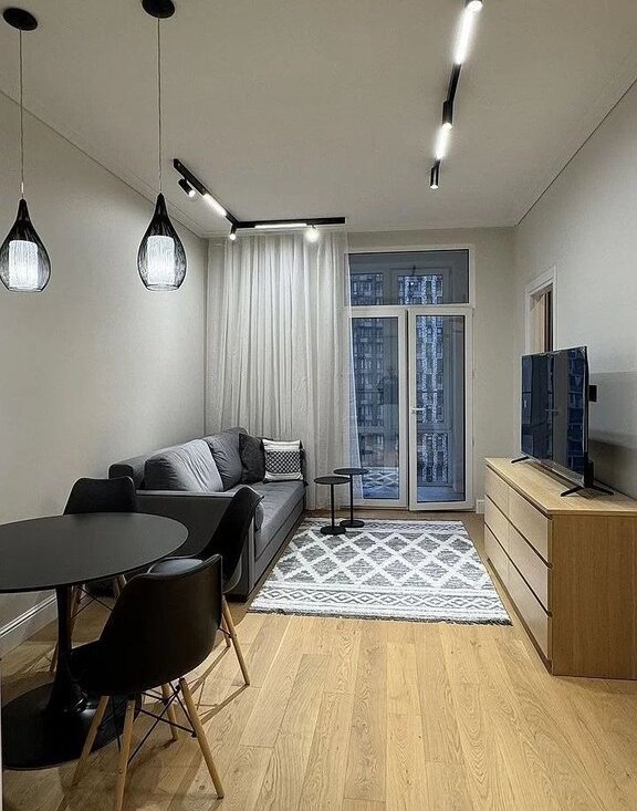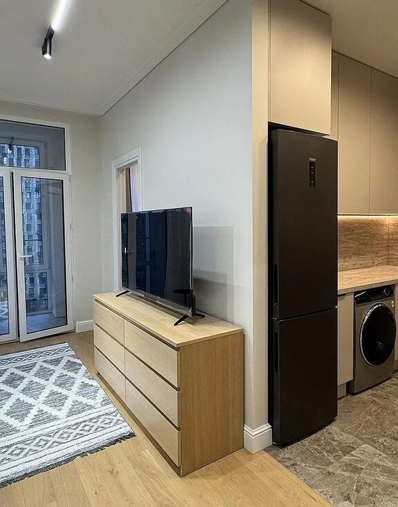 - Гостиная - совмещенная с кухней, полностью мебелирована, с большим телевизором 55 дюймов. Выход в застекленную лоджию с панорамными окнами.