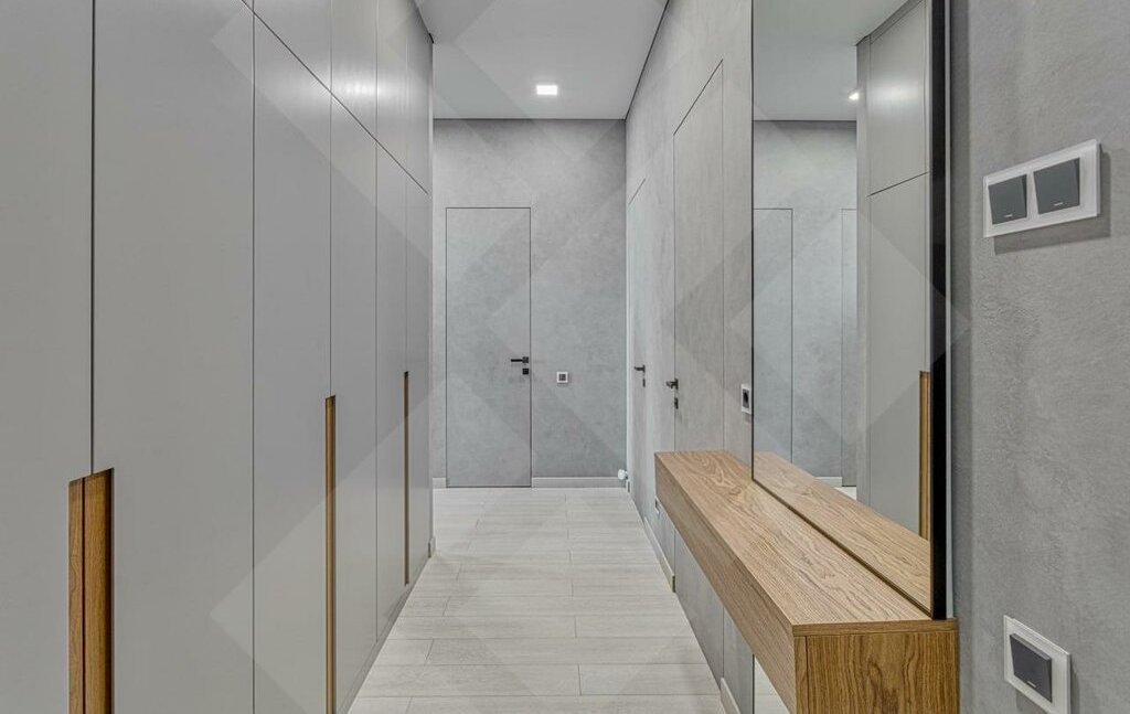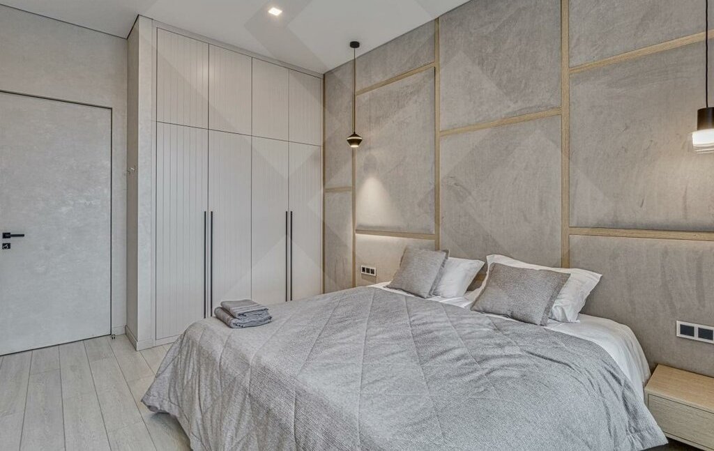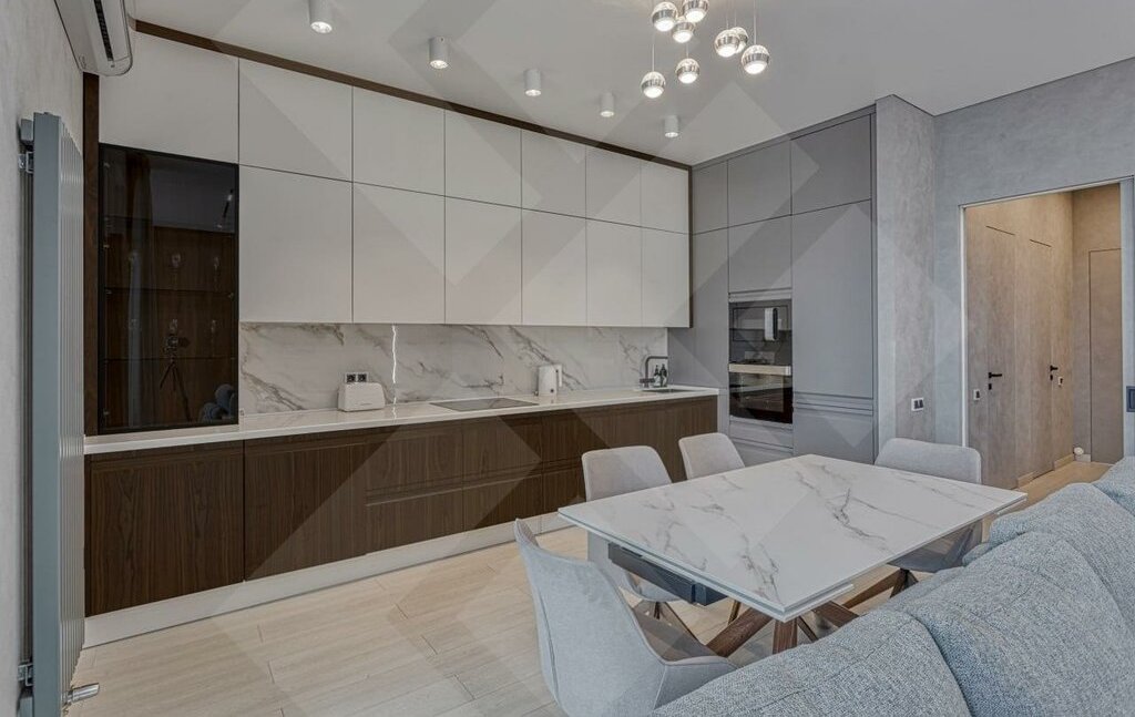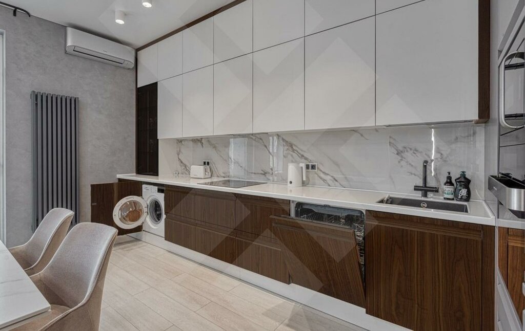 Кухонный гарнитур с духовым шкафом и варочной поверхностью, стиральная машина, посудомоечная машина, холодильник. В каждой комнате установлен кондиционер.