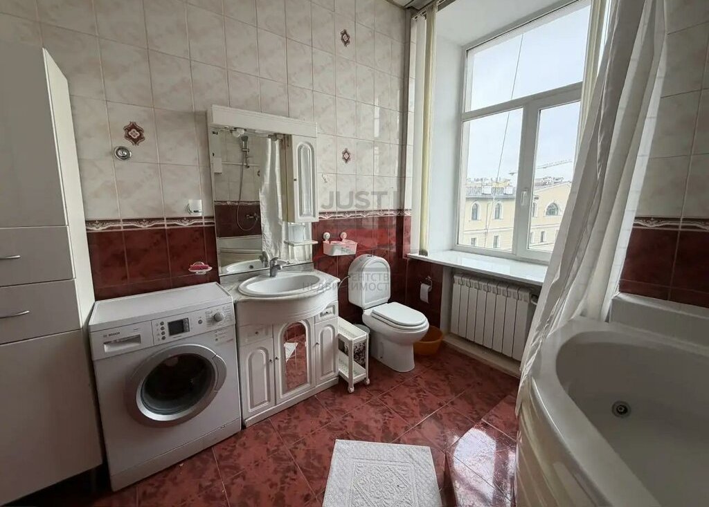 В большой ванной комнате с окном расположена ванная -джакузи .