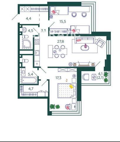 2. Кухня-гостинная разделяет между собой спальню и детскую, что создает приватность и независимость друг от друга.