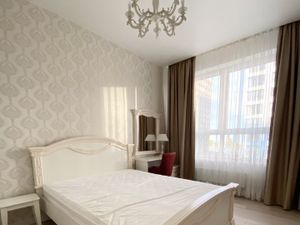 Квартира светлая и уютная. Высокие потолки добавляют воздуха и простора. Комфорт в любое время года обеспечивают кондиционеры и подогрев полов. Планировка продуманная и функциональная — кухня, гостиная, две спальни, два санузла (ванная и душевая кабина), гардеробная и лоджия.
