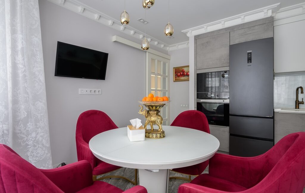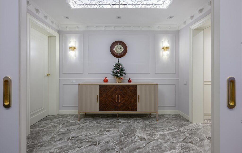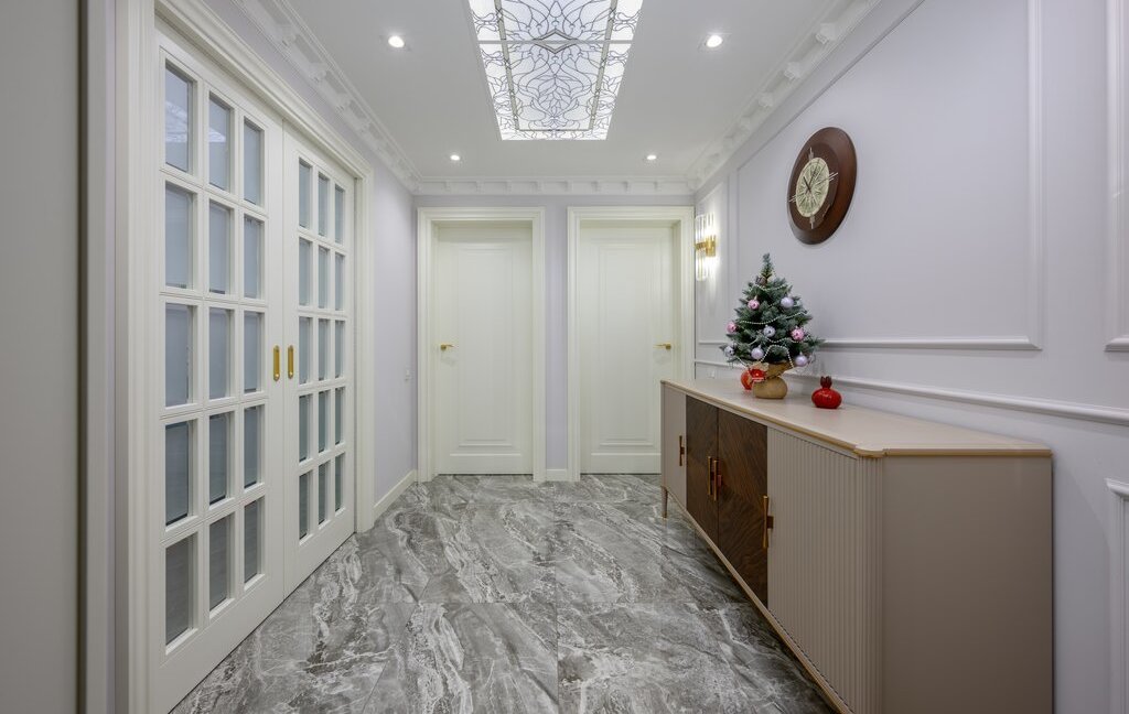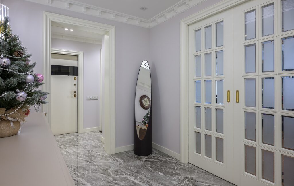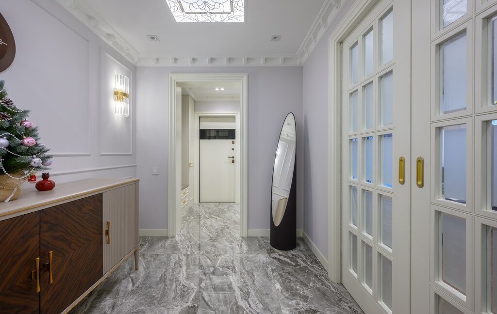 Ремонт и материалы: Дизайнерский ремонт премиум-класса. Полы: мрамор в холле и на кухне (с подогревом), тёплая инженерная доска в комнатах. Весь декор стен и потолков выполнен из гипса по индивидуальным эскизам.