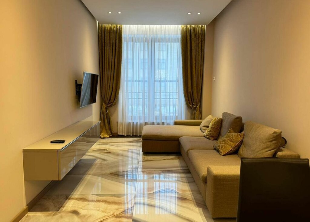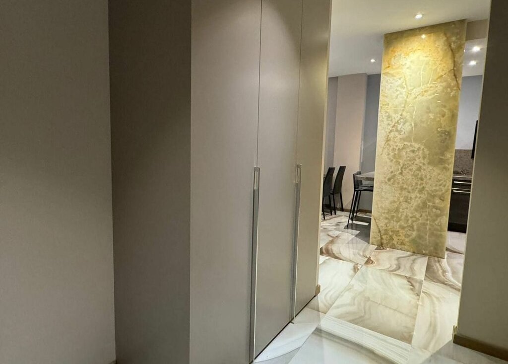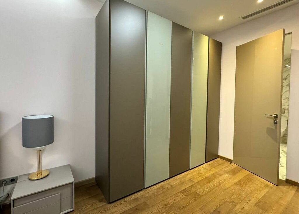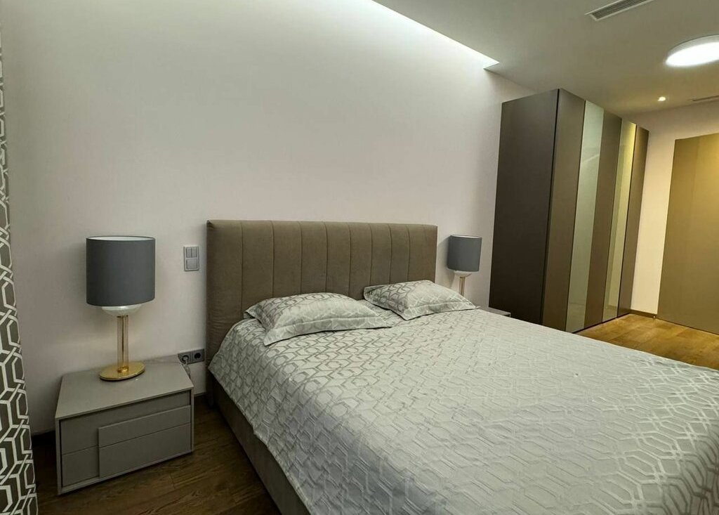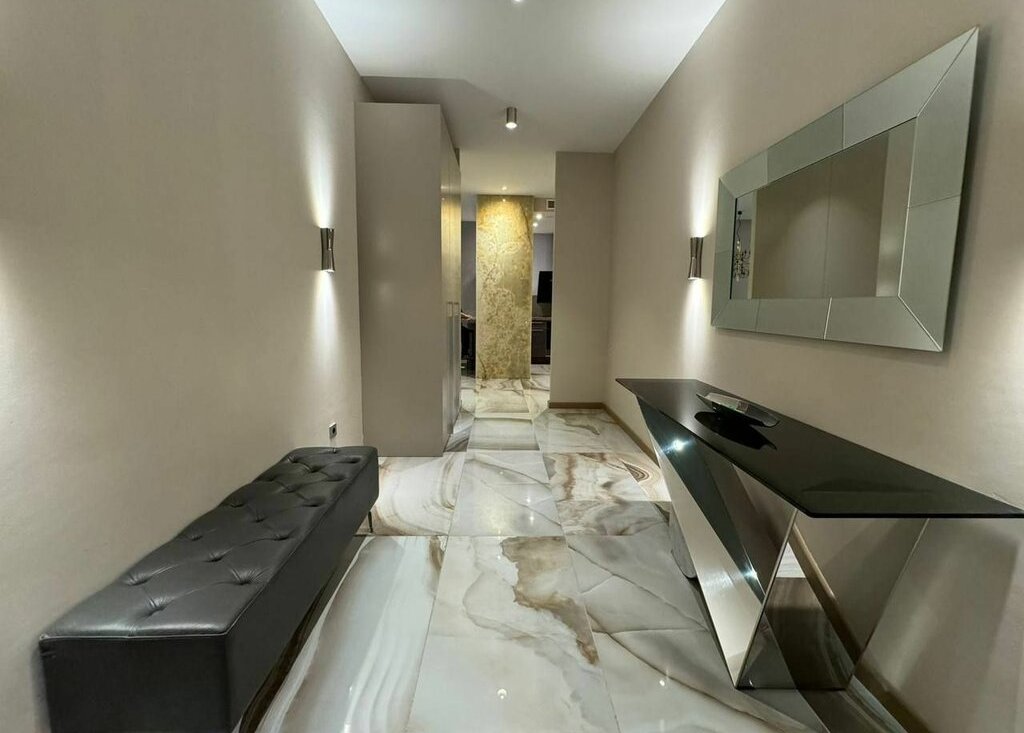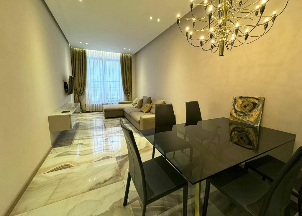 Общая площадь составляет 100 кв.м., в квартире 3 комнаты, 2 санузла, постирочная. В отделке использовались лучшие материалы. Квартира полностью мебелирована и готова к проживанию.