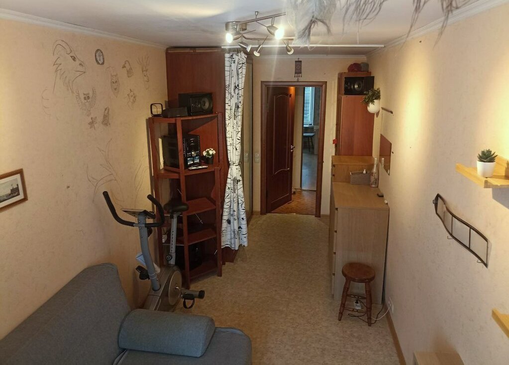 В квартире есть вся необходимая мебель (3 спальных места, стеллажи, шкафы, столы письменные и обеденный, стулья, комоды, тумбы) и техника (стиральная машина, микроволновка, плита с духовкой, вытяжка, пылесос, утюг, принтер и даже велотренажёр))