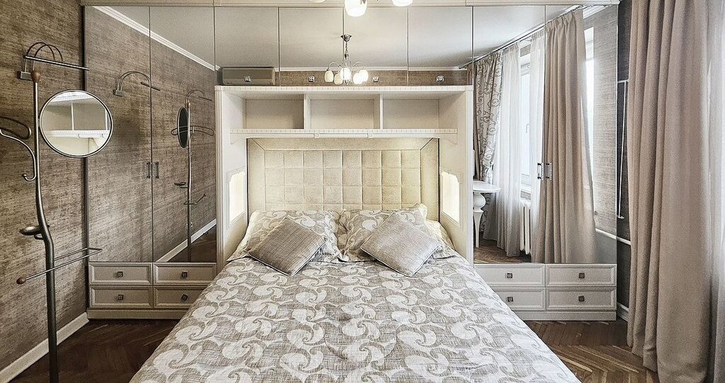 Главная спальня с двуспальной кроватью, вместительными шкафами, комодом и удобным рабочим столом. Вся мебель индивидуального изготовления.