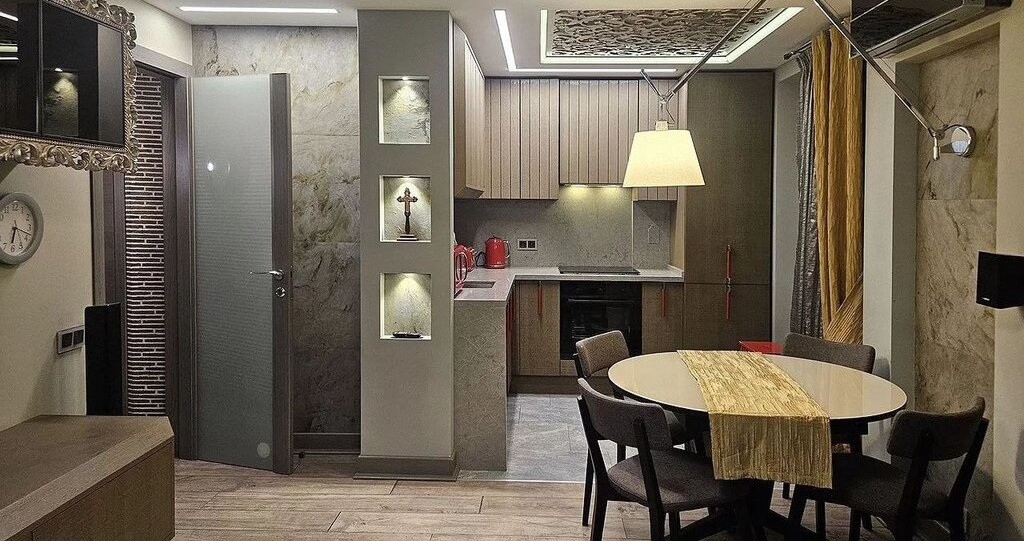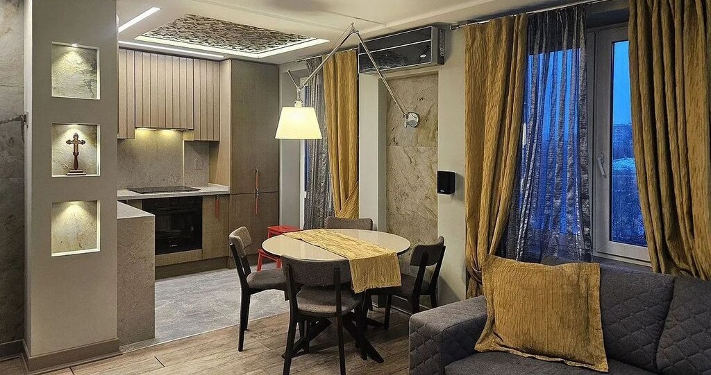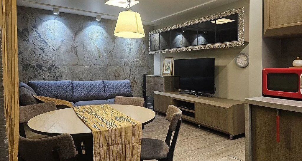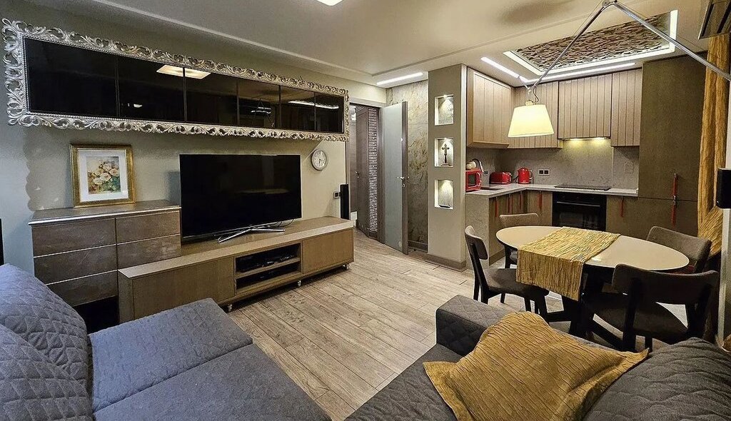 Стильные интерьеры общей зоны, объединенная кухня-гостиная располагают к комфортному отдыху всей семьи. Стол раскладывается на 6 человек. Широкий, мягкий диван, большой телевизор, акустика на 6 каналов. При этом в квартире есть еще три изолированные спальни и можно, при необходимости, оборудовать четвертую.