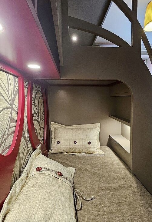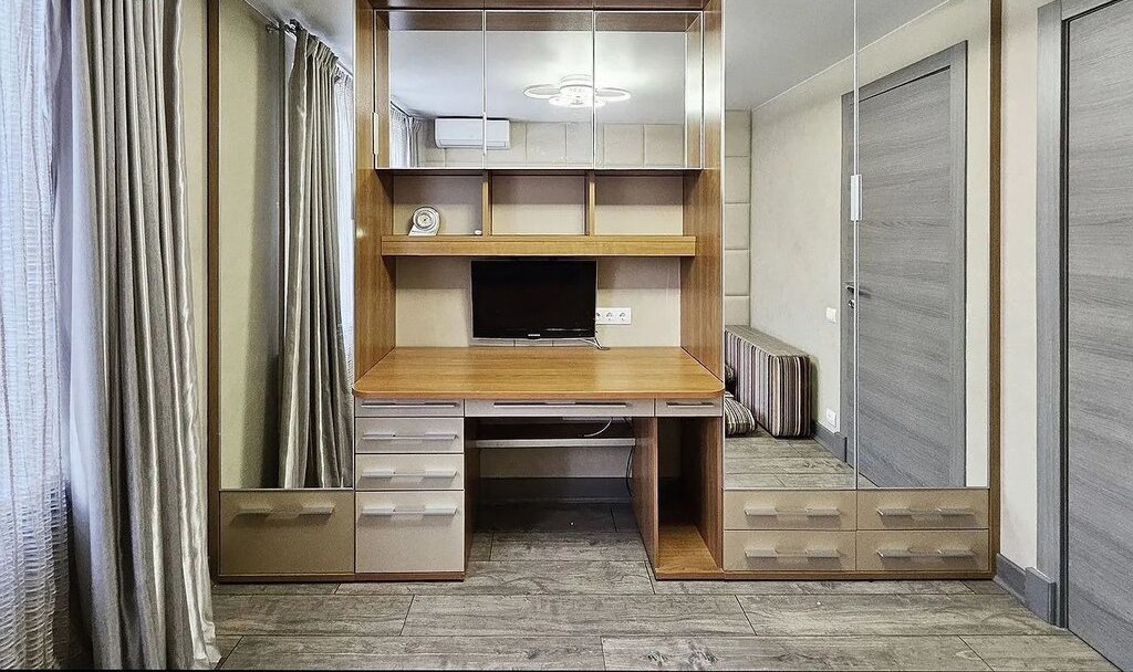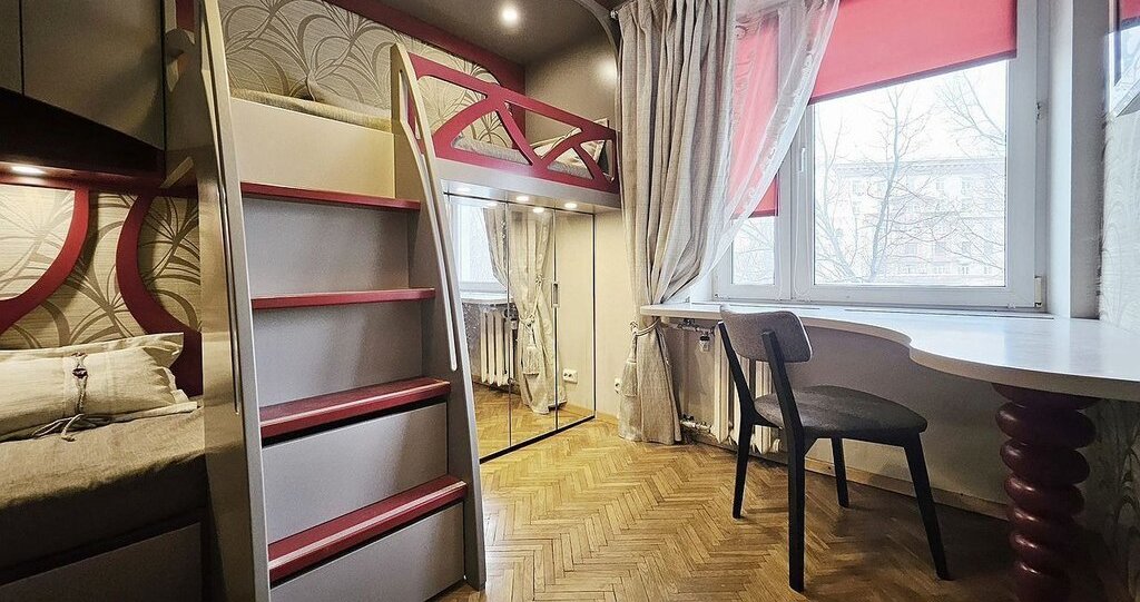 Детская комната тоже по индивидуальному проекту, с двумя кроватями в разных уровнях, интегрированным зеркальным шкафом, полочками, нишами и выдвижными ящиками. Письменный стол выполнен, как продолжение подоконника.