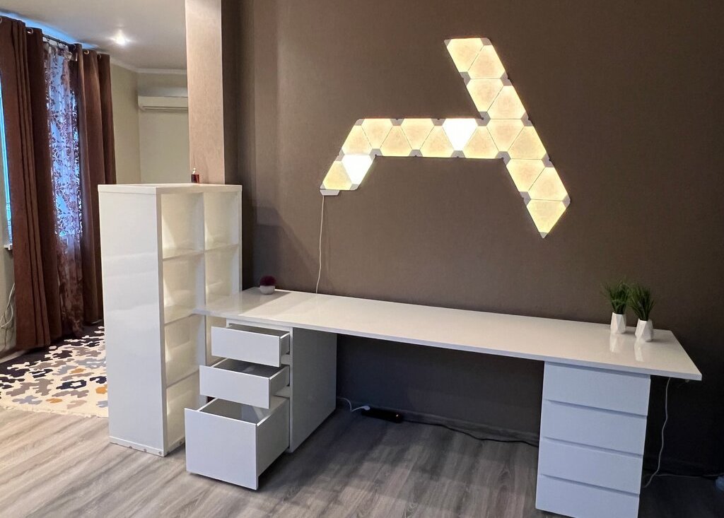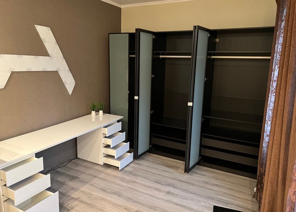 Отдельный кабинет (гостевая): Большой рабочий стол, умный светильник, раскладной диван, гардеробный шкаф. Три окна во двор — тишина для концентрации.