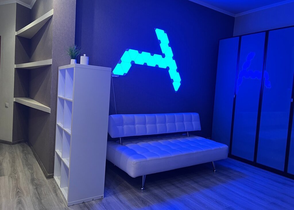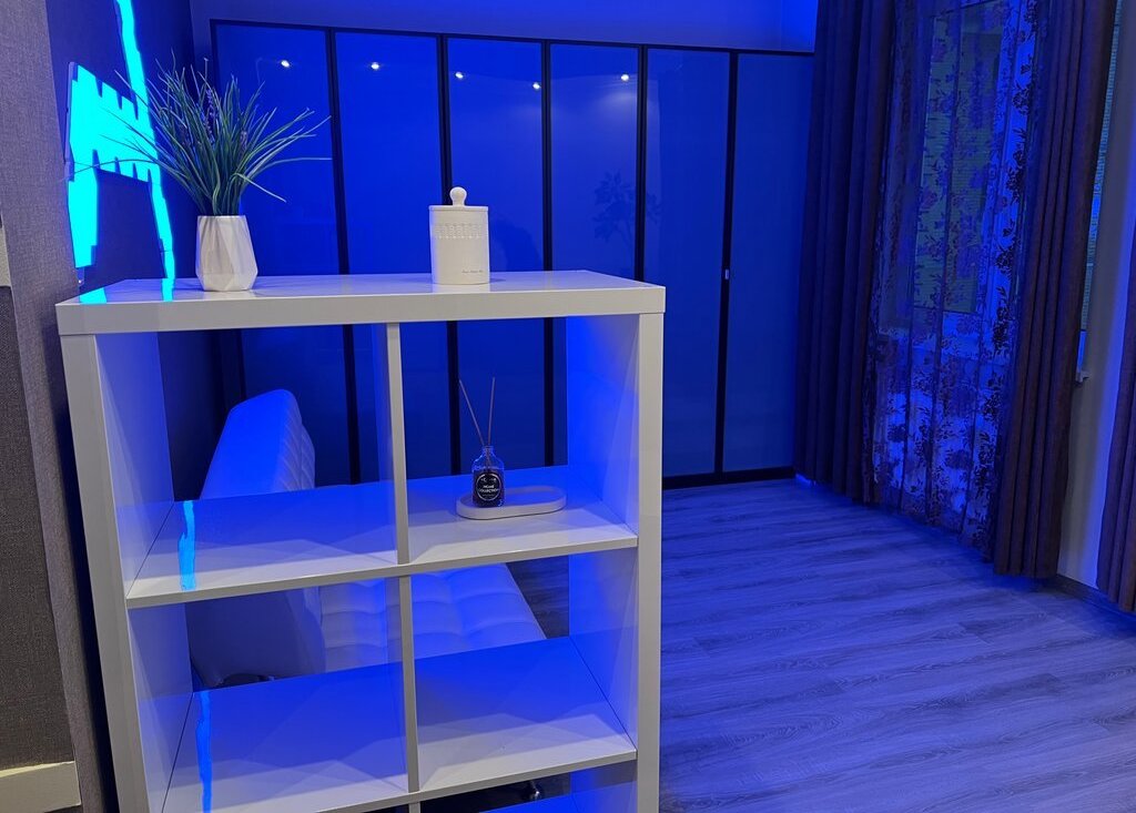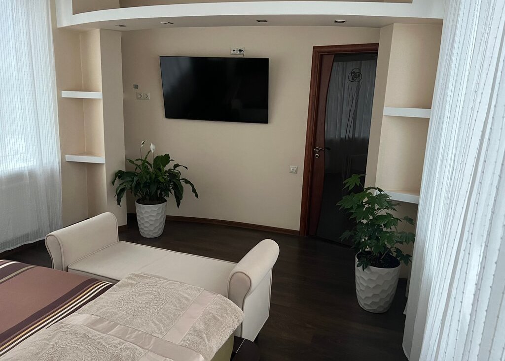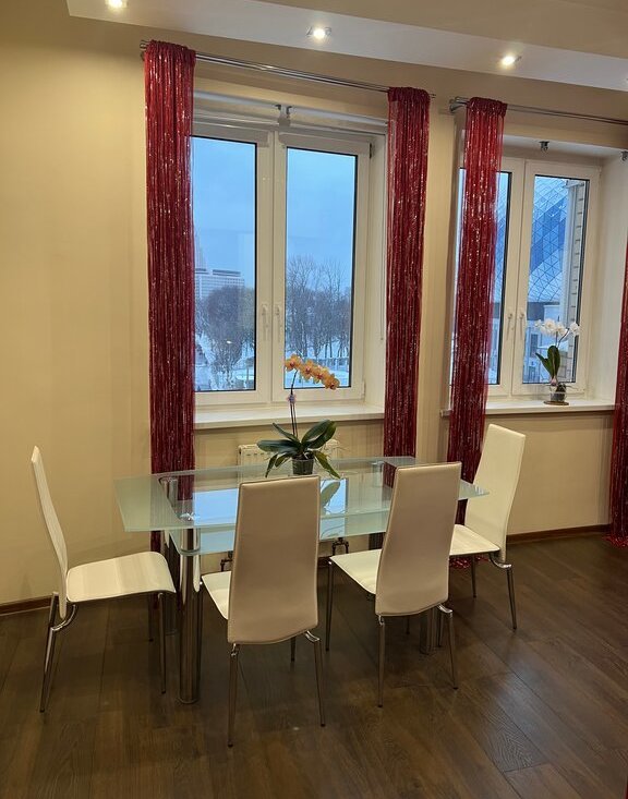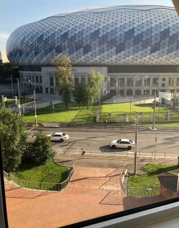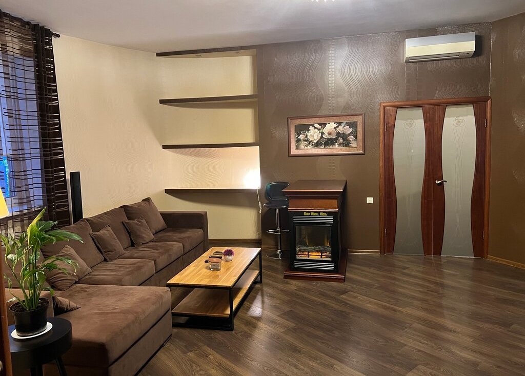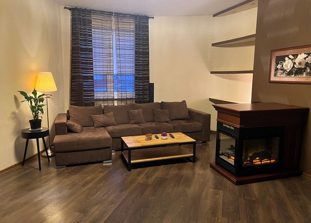 Уютная круглая гостиная (зал): Сердце квартиры с электрокамином (эффект живого огня), огромным раскладным диваном, полукруглым телевизором и аудиосистемой. Три окна: вид на ВТБ Арена и тихий двор.