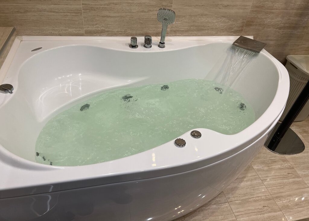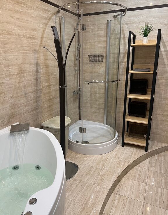 Совмещенный санузел премиум-класса: Гидромассажная ванна и душевая кабина, стиральная машина с сушкой, теплый пол, система защиты от протечек.