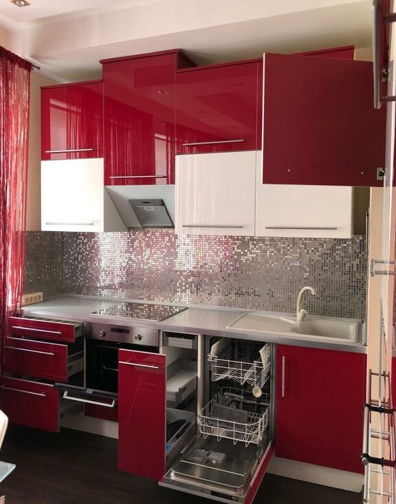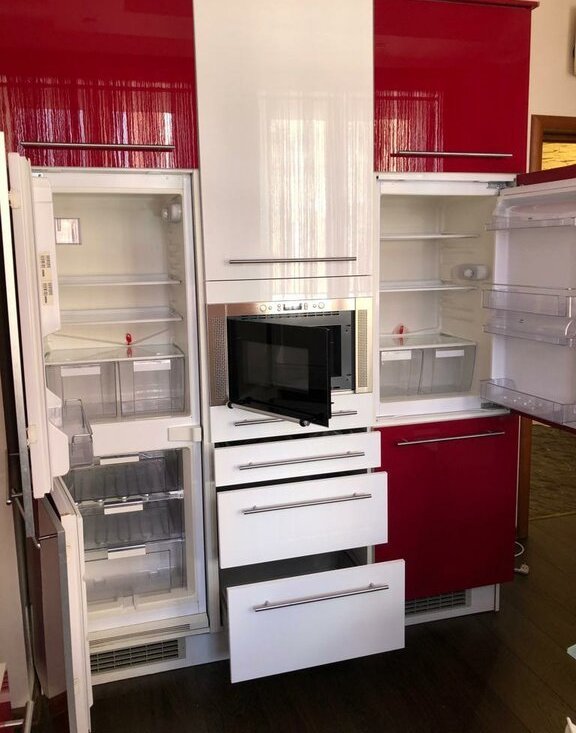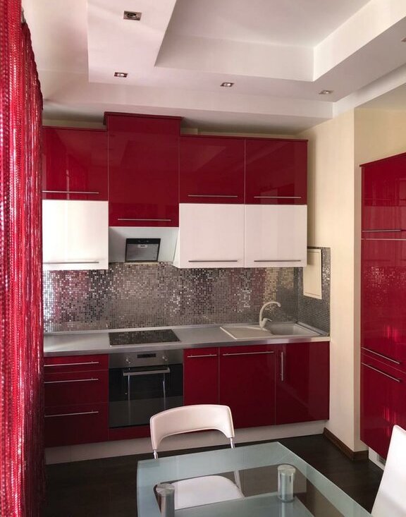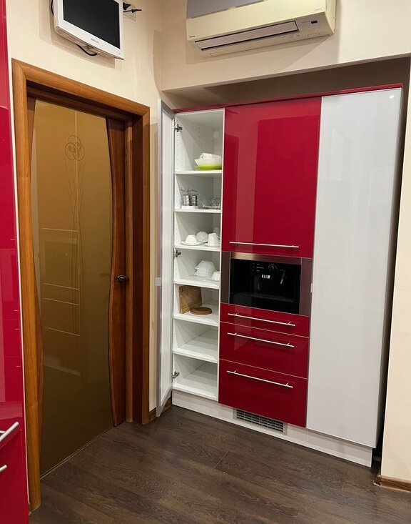 Просторная изолированная кухня-гостиная: Полностью оборудована для приема гостей: 2 холодильника, морозильная камера, варочная панель, духовой шкаф, посудомоечная машина, микроволновая печь. Дизайнерский стол на 6 персон. Вид из окон в вечернее время — как живая картина.