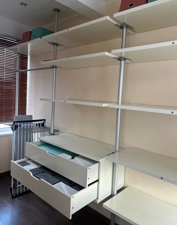 Просторная гардеробная (2 окна!): система хранения, гладильная доска, наполнена светом.