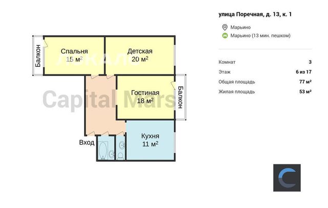 3-комнатная квартира: Москва, Поречная улица, 13к1 (77 м²)