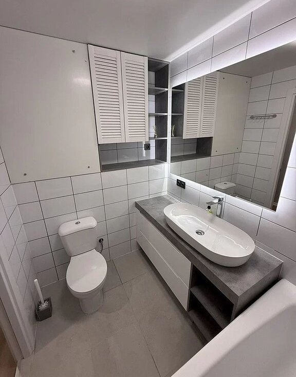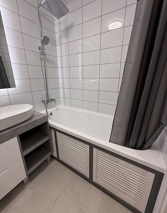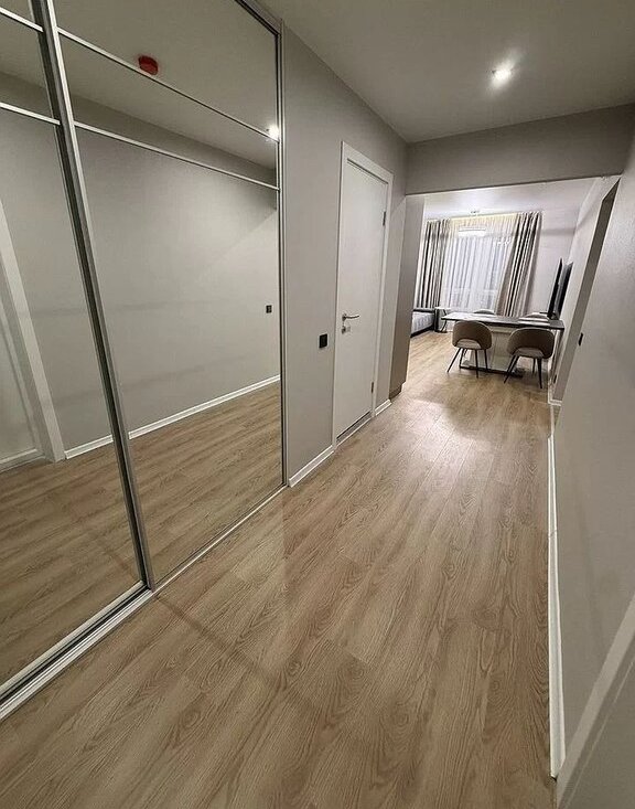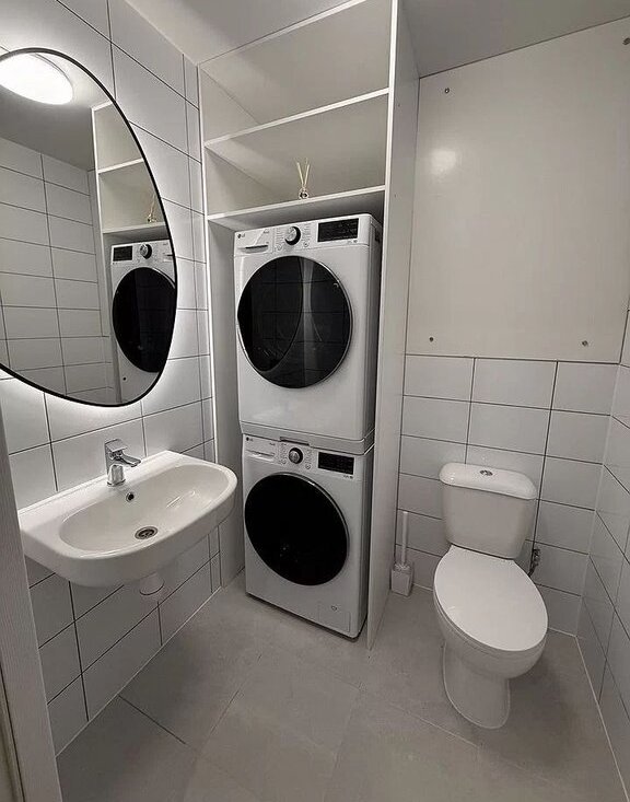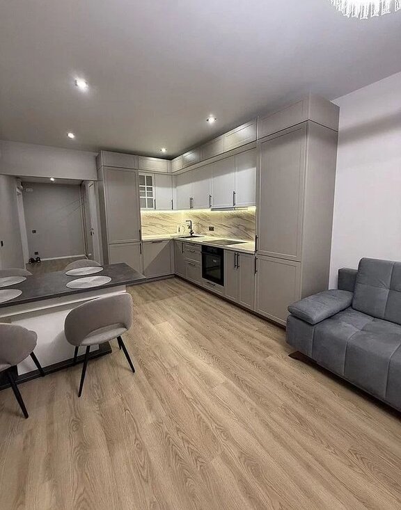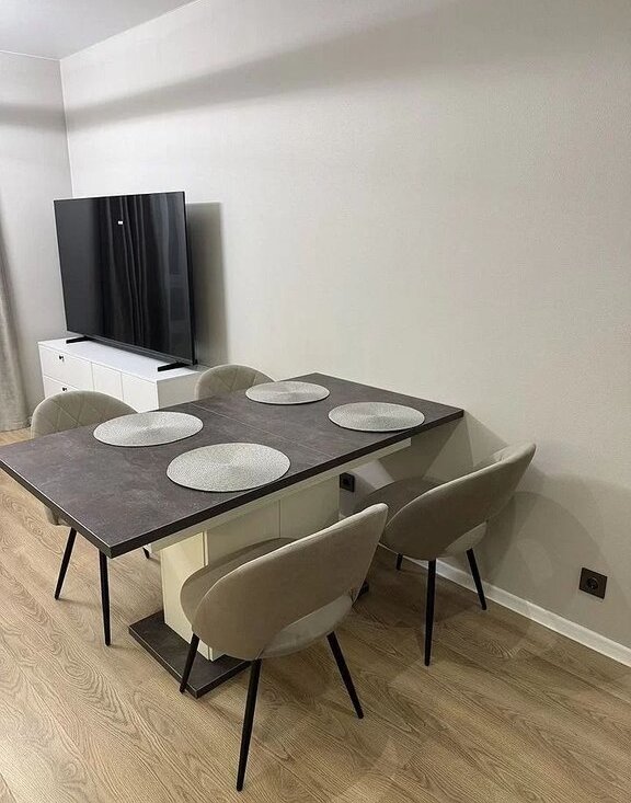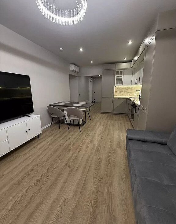 Кухня- Гостиная впечатляет своим размером и уютом. Здесь установлен большой телевизор Sаmsung диагональю 75 дюймов, который создаст атмосферу домашнего кинотеатра для ваших вечеров. Квартира также включает два современных санузла, один из которых оборудован стиральной и сушильной машиной LG, что значительно облегчит выполнение повседневных задач.