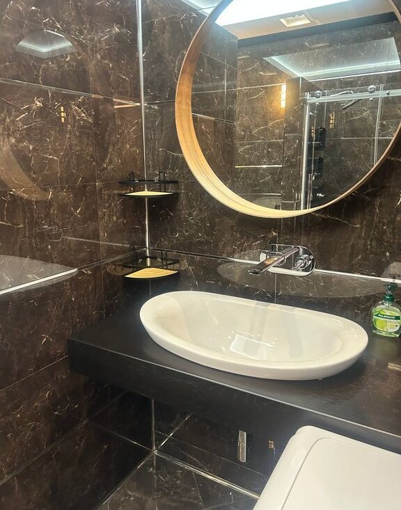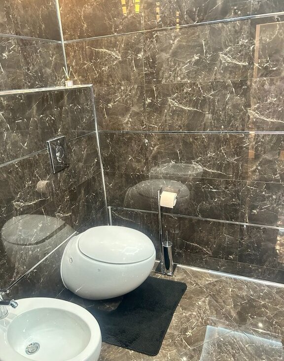 Санузлы: Итальянская сантехника Laufen и широкоформатная плитка под мрамор (Италия).