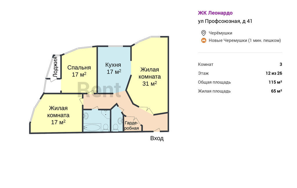 Предлагается 3-комнатная квартира общей площадью 115 м² в ЖК "Леонардо" недалеко от станции метро "Новые Черемушки". Высокие потолки увеличивают пространство, наполняя его светом. Для комфортного проживания в наличии имеется вся необходимая мебель, а также система теплого пола. Кухонный гарнитур оснащен посудомоечной машиной, духовой печью. Для удобства организована гардеробная комната. Из дополнительных преимуществ - наличие лоджии. Окна обращены во двор и на улицу.