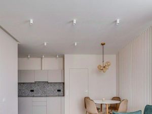 Квартира полностью меблирована и оснащена всем необходимым для комфортной жизни. Кухонная зона площадью 8 м² с кухонный гарнитуром, оснащенным холодильником, посудомоечной машиной, духовым шкафом, плитой и печью СВЧ.