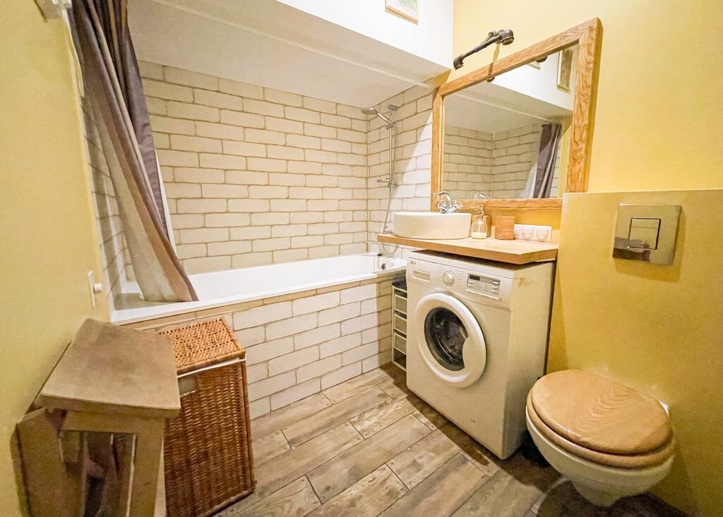 Санузел в квартире совмещенный, установлена стиральная машина.