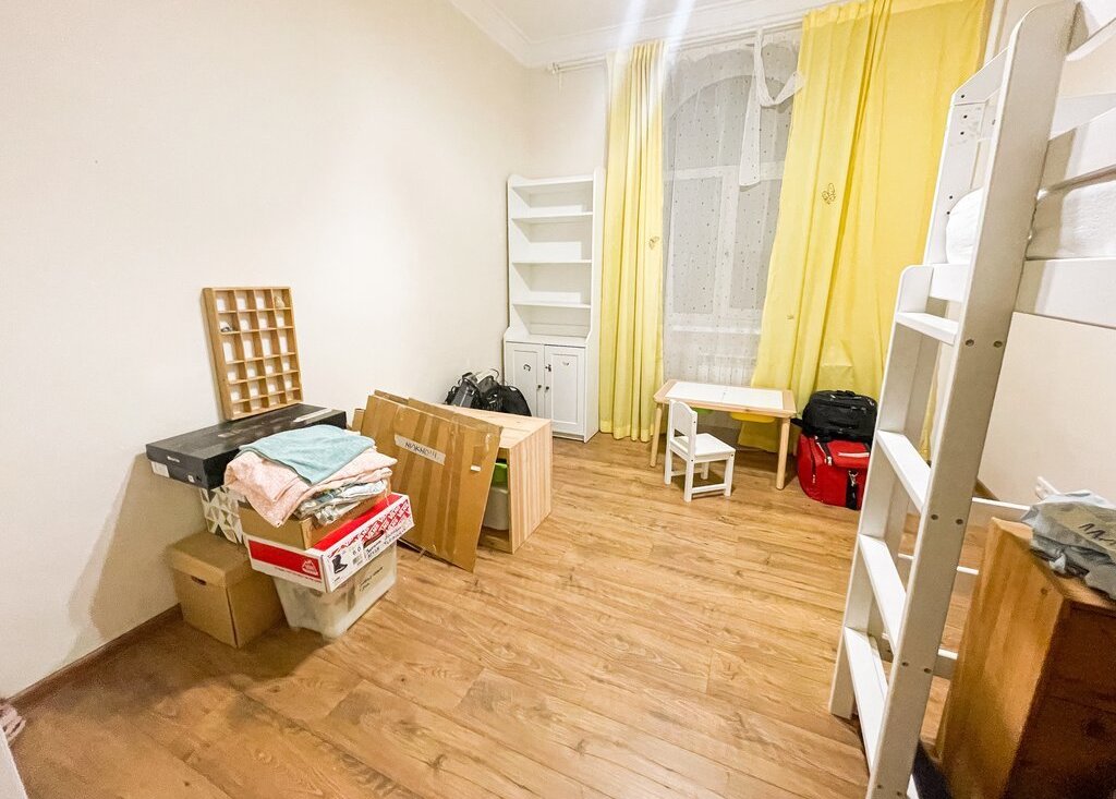 Две изолированные комнаты. Кухня-гостиная совмещена (есть раздвижная перегородка для изоляции кухни). Также есть огромные ниши и кладовка для хранения вещей.