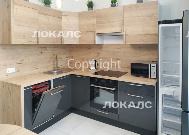 Кухня: кухонный гарнитур, стол со стульями, 2-камерный холодильник, стеклокерам. варочная панель с сенсорн. управл. на 4 конфорки, духовой шкаф, вытяжка, посудомойка 45 см., микроволновка, эл. чайник, посуда.