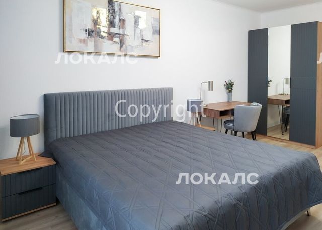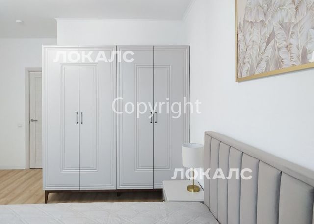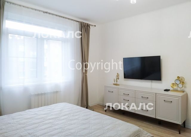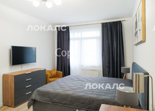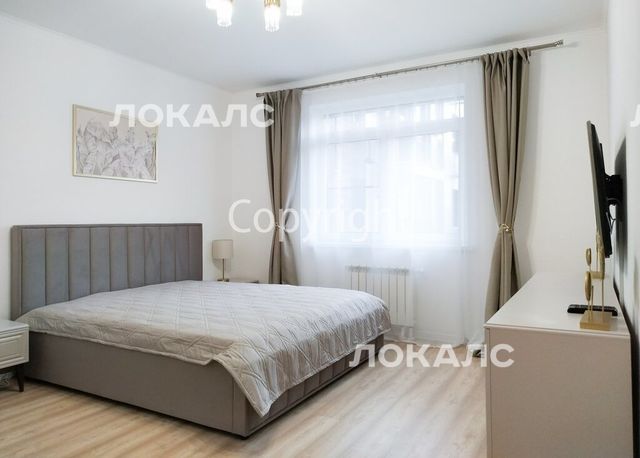 Спальня2: кровать king size 180 см шириной, 2 прикроватные тумбы со светильниками, комод, телевизор 43'', шкаф.
