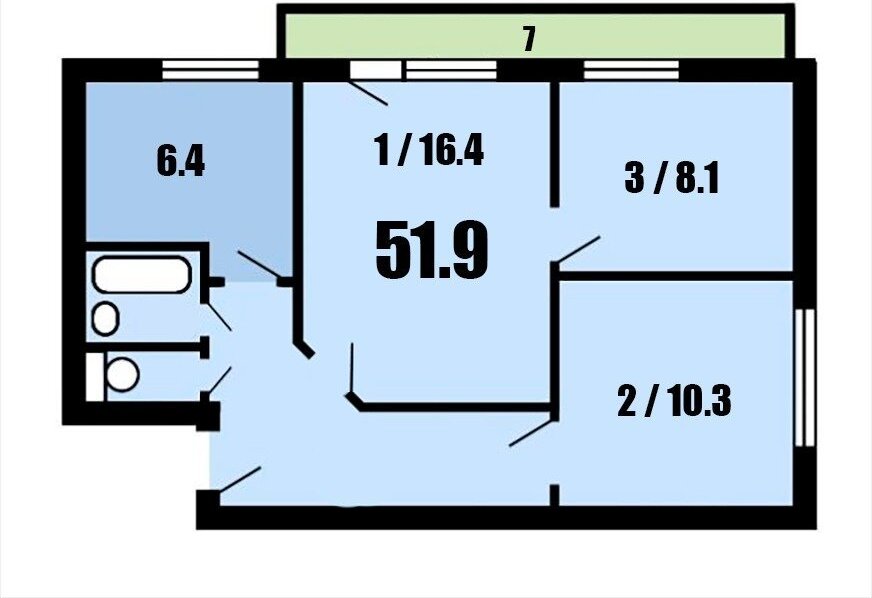 Общая площадь - 51,9 кв.м. без учета огромного балкона.