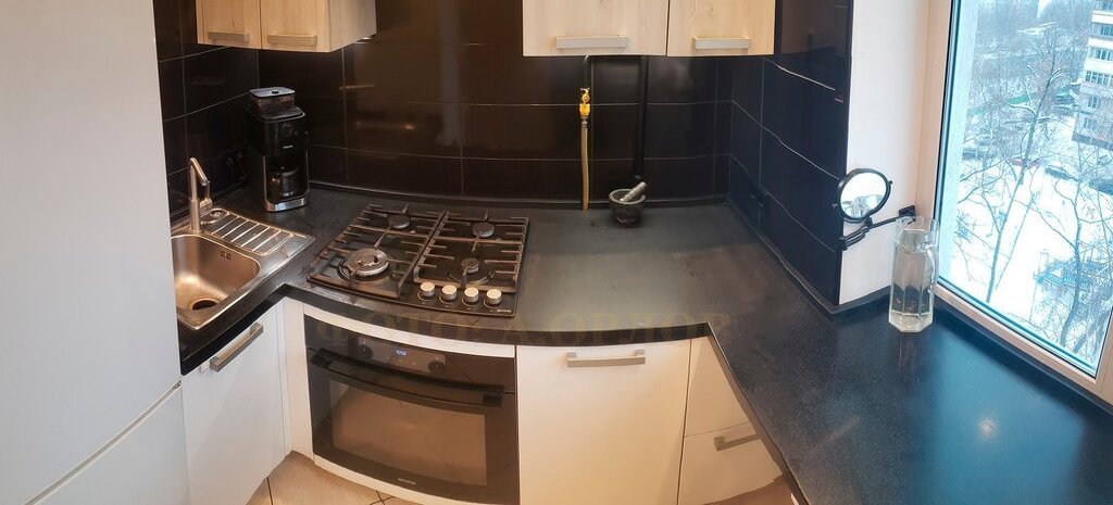 Кухня - 6,4 кв. м. Кухонный гарнитур со встроенной техникой остаётся покупателю. Изготовлен на заказ по индивидуальному дизайнерскому проекту. Особенности: