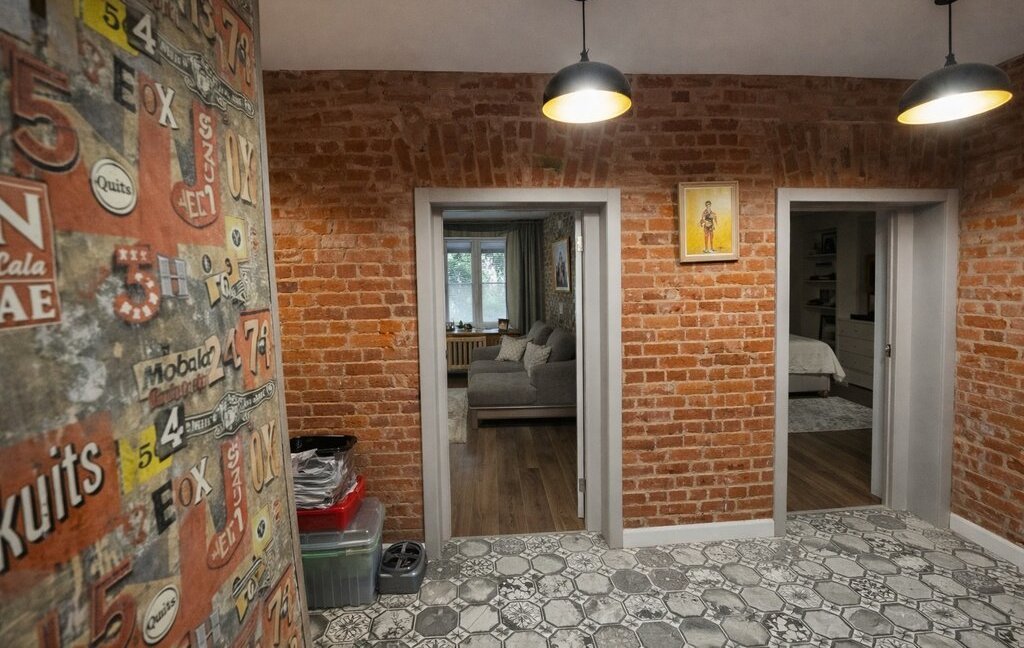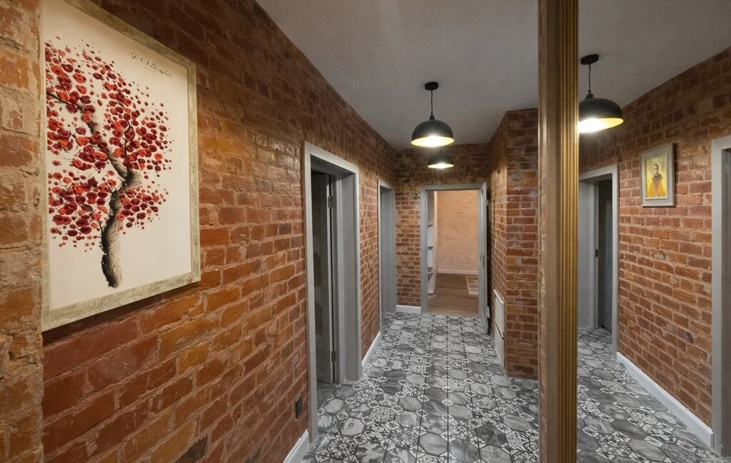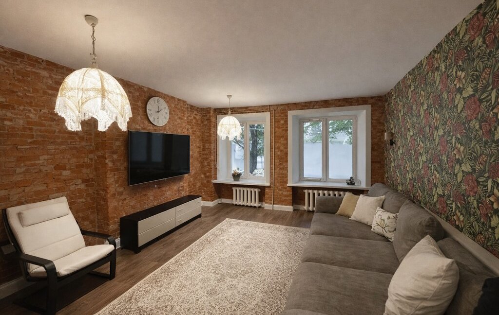 Авторский интерьер с кирпичной кладкой и дизайнерскими акцентами