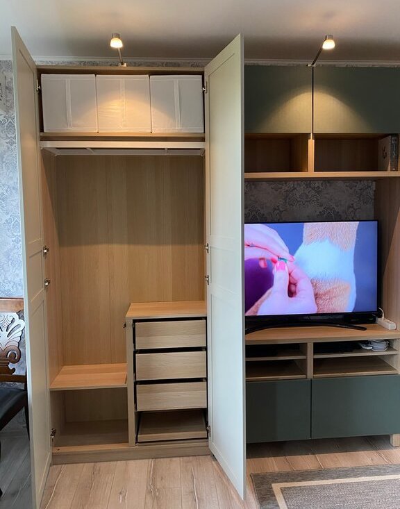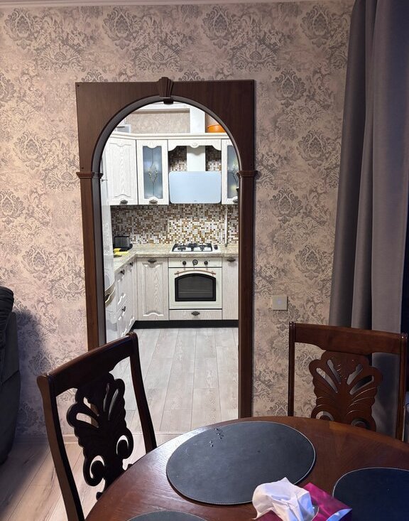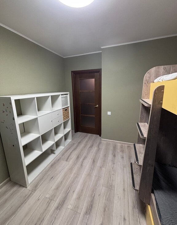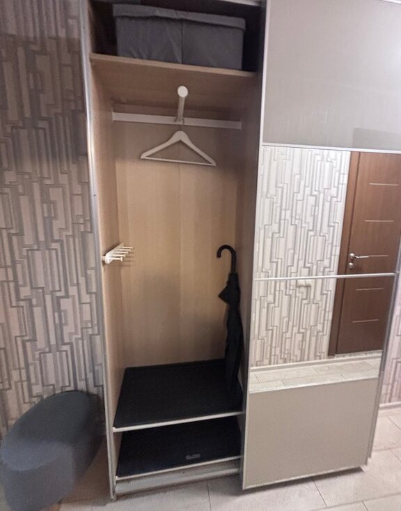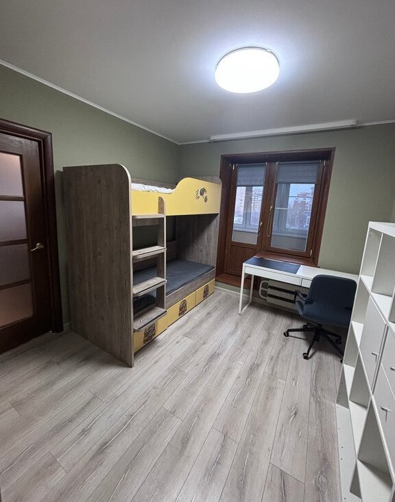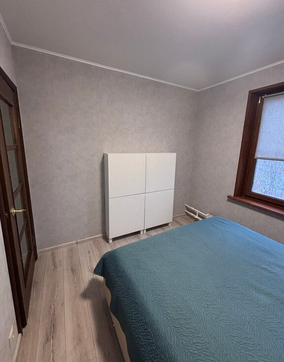 Квартира полностью меблирована - двухспальная кровать , диван и двухъярусная кровать. Шкафы, обеденный раскладывающийся стол со стульями , письменный стол со стулом.