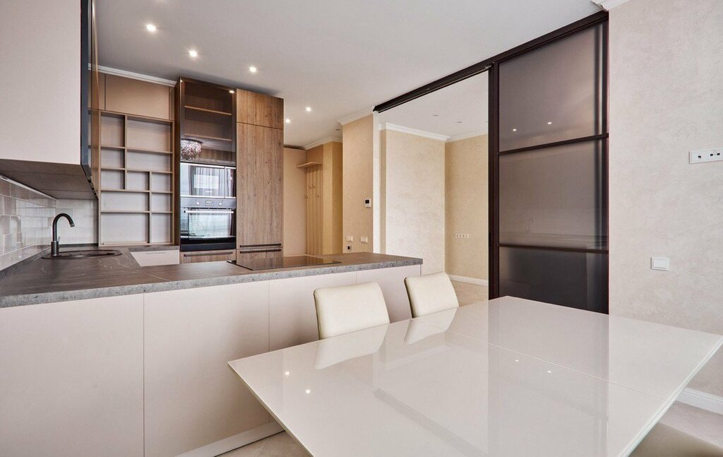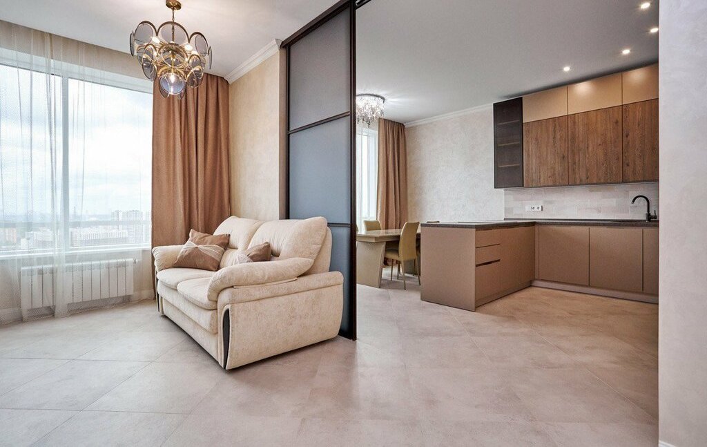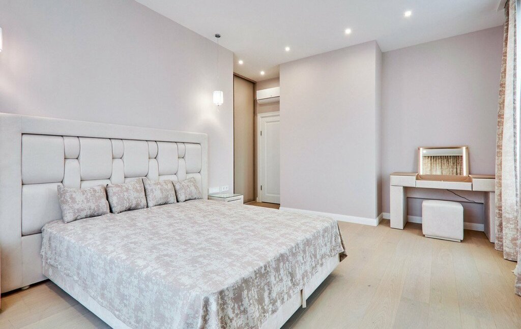 98кв.м, две отдельные спальни, большая кухня гостиная, разделяемая перегородкой при надобности. Большая гардеробная и 2 санузла, тёплые полы.