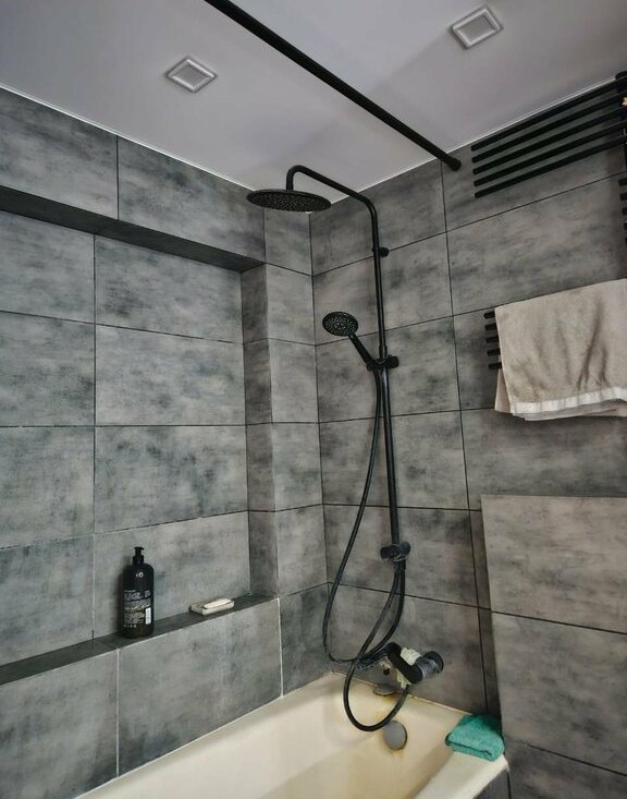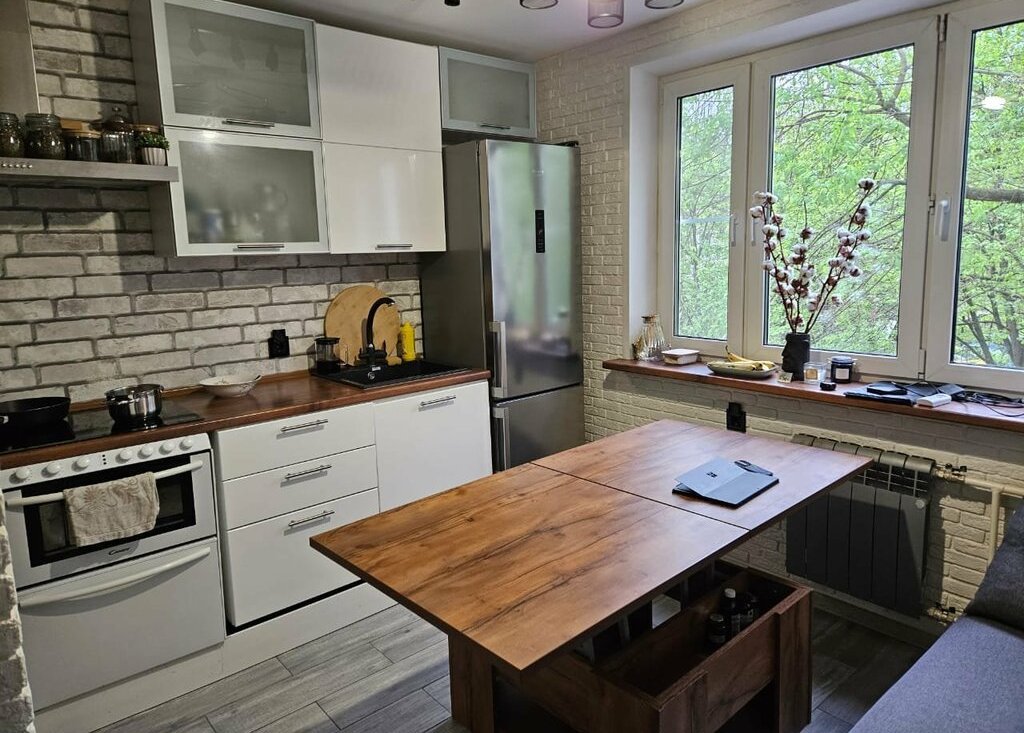 Большая светлая кухня 10 квадратных метров с видом на зелёный двор. Санузел совмещённый из современных материалов и новой сантехникой.